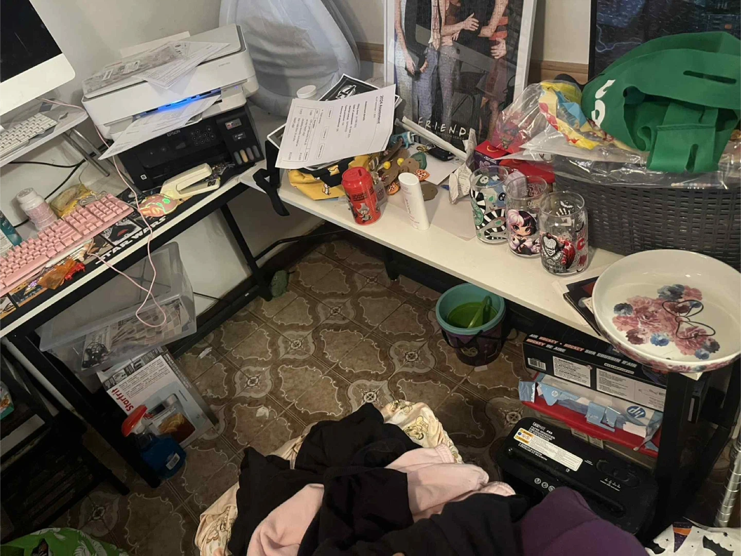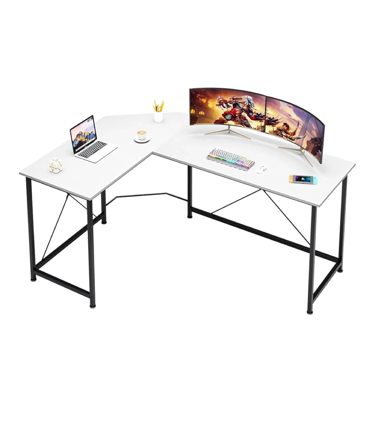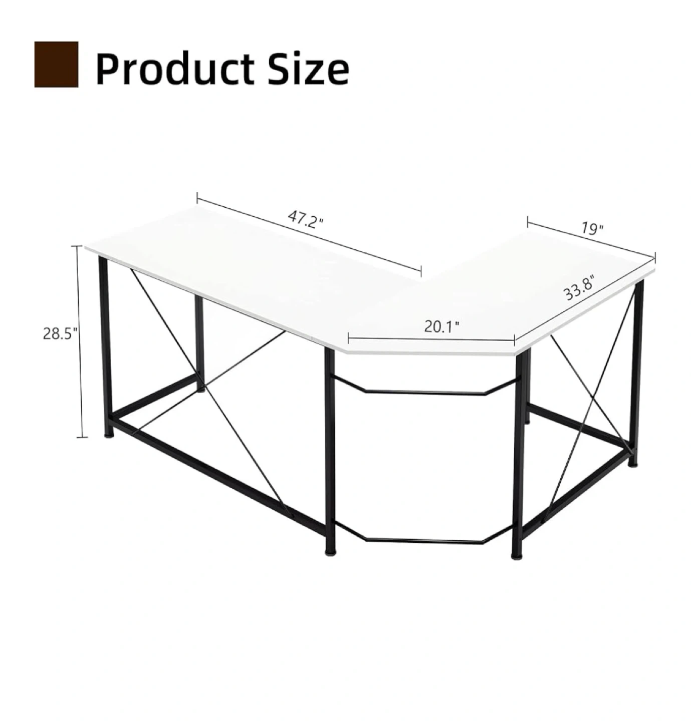Selling a white L-shaped corner desk! It's perfect for maximizing space in your home office or gaming setup. The desk features a sturdy black metal frame and a spacious white top. Dimensions: - 47.2" x 19" - 33.8" x 20.1" - Height: 28.5"