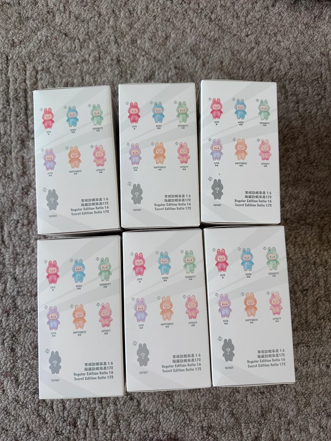 Authentic Labubu’s from Popmart. Boxes have been popped online so i know which ones i have. 2 - Serenity (green) 2 - Happiness (pink) 1 - Loyalty (yellow/pink) 1 - Hope (blue) SOLD meetup north edmonton