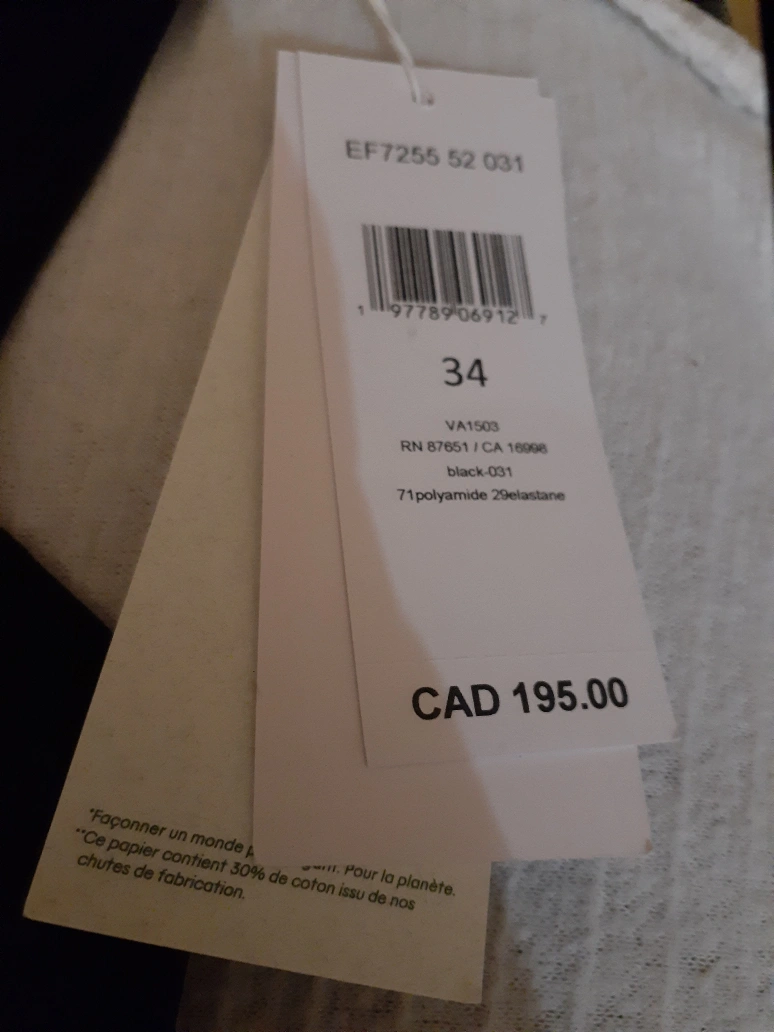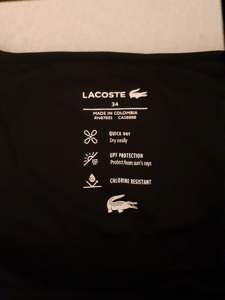 Selling a lovely black Lacoste dress in size 34. It's made in Colombia and is quick-drying, offers UPF protection, and is chlorine resistant. The dress is made of 71% polyamide and 29% elastane. Originally bought for $195 CAD