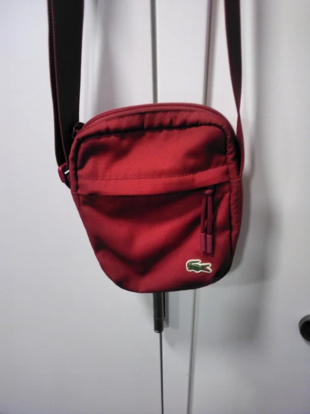 Two crossbody bags for sale! One is a red Lacoste bag with the signature crocodile logo. The other is a black Herschel bag. Both are in great condition and perfect for carrying your essentials
