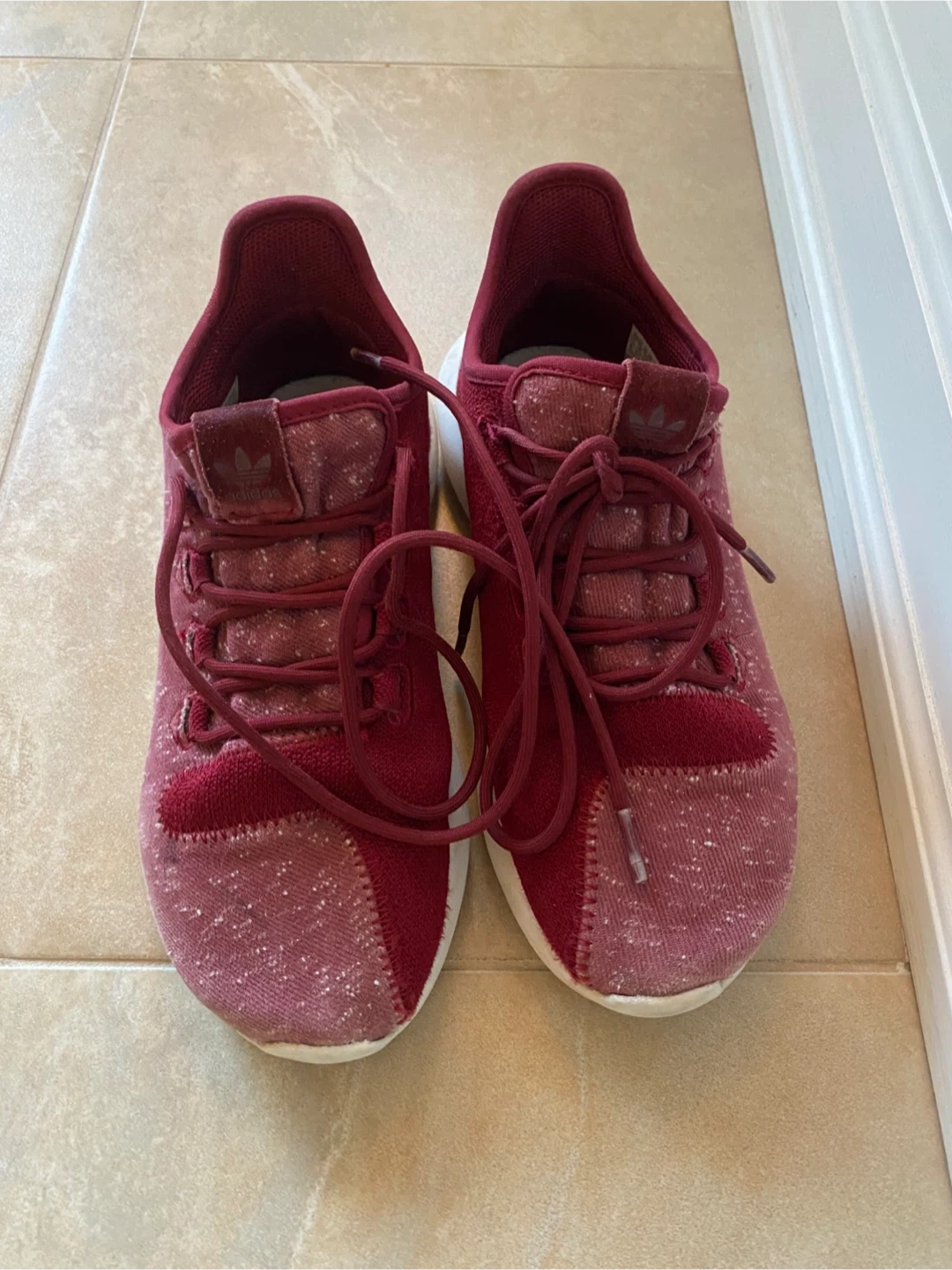 Selling a pair of Adidas Tubular Shadow sneakers in a burgundy colour. The sneakers have a unique design and are super comfy for everyday wear.