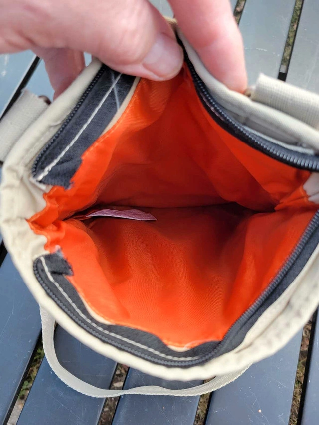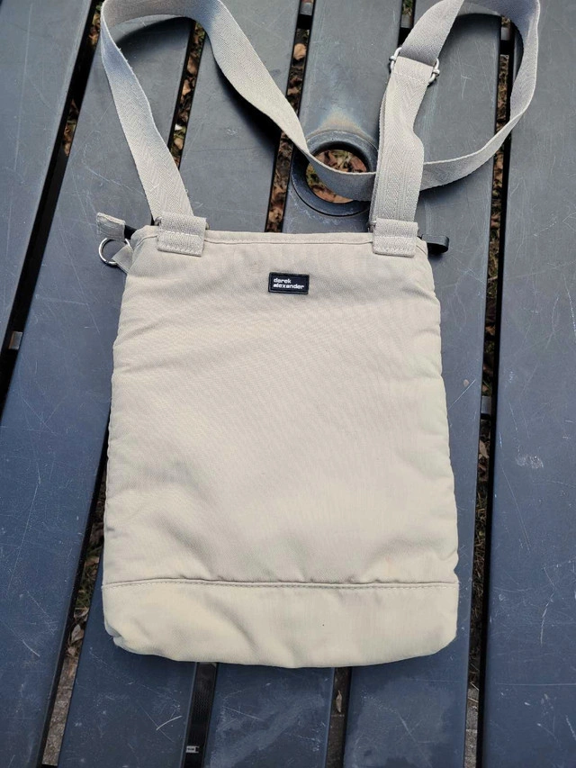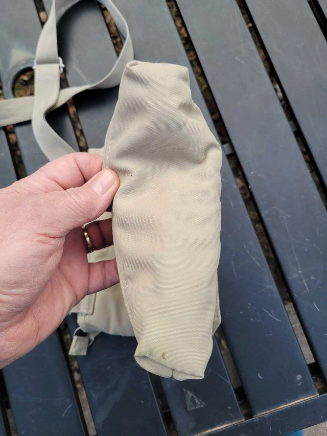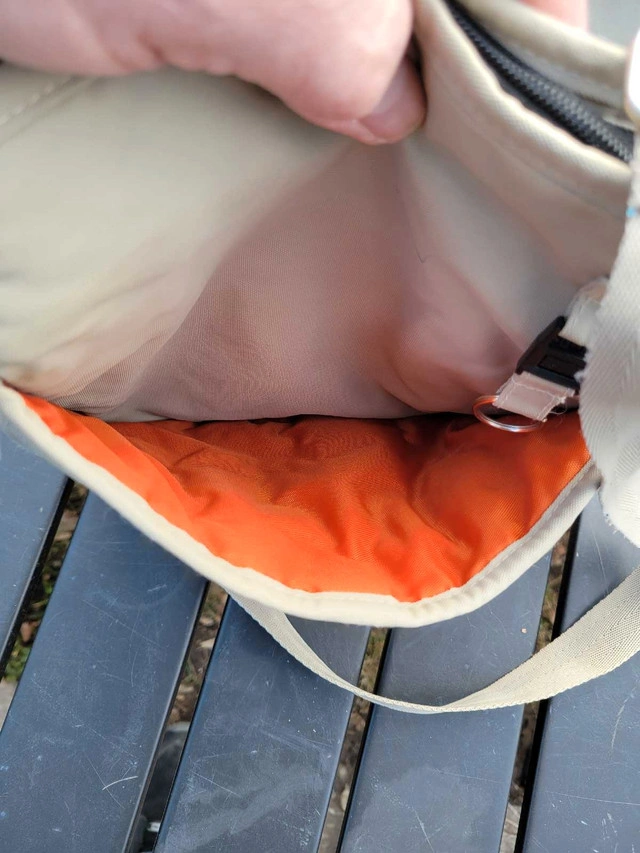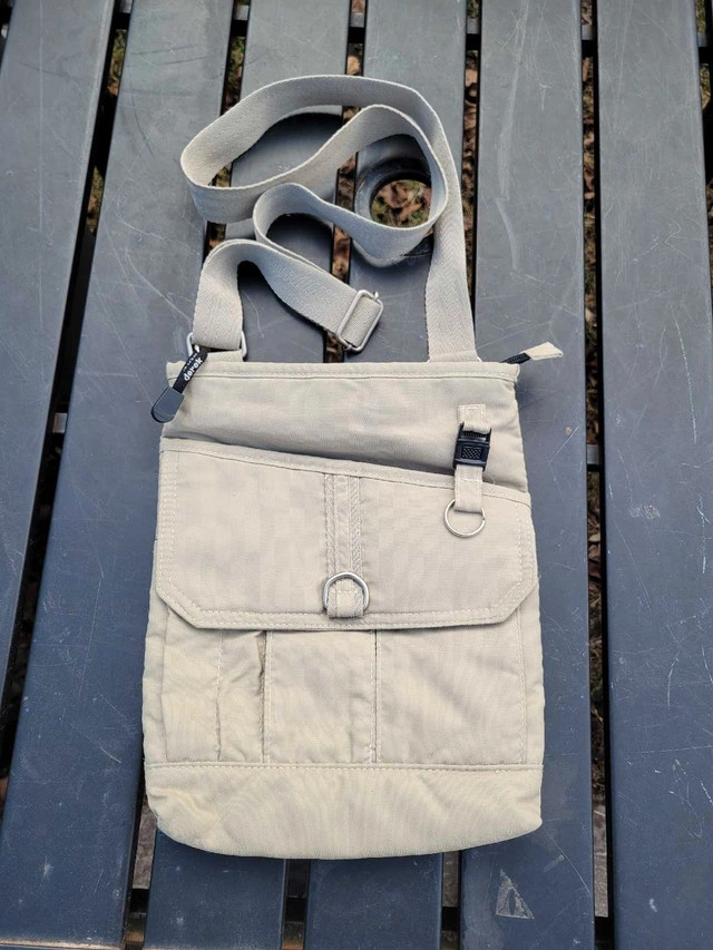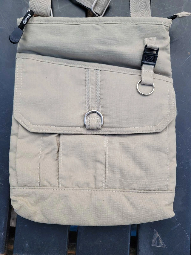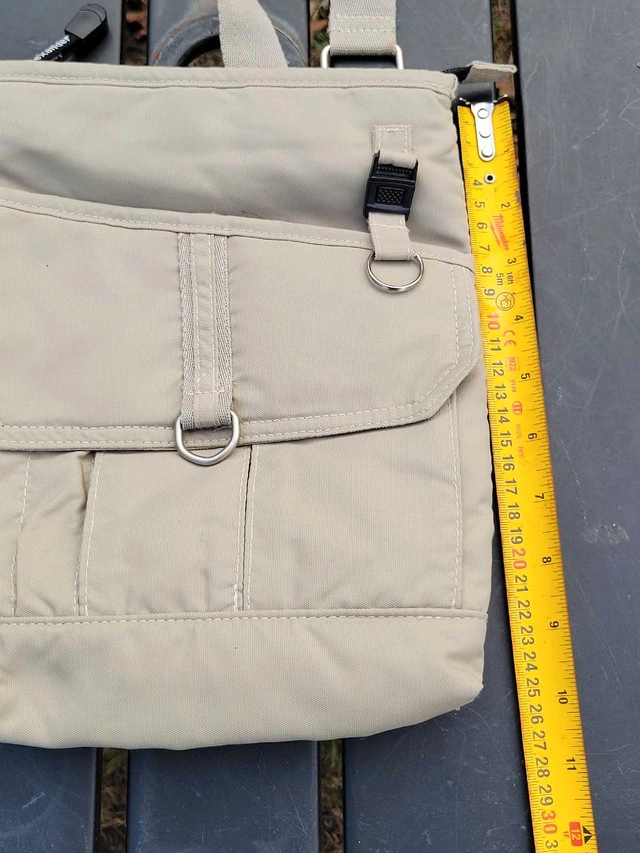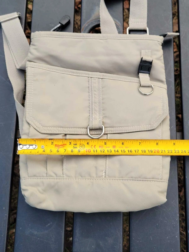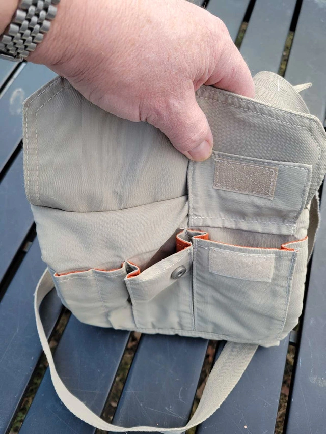 This great bag has alot of compartments and is soft and comfortable to wear. Has a few pen marks but otherwise in great shape for a vintage bag.