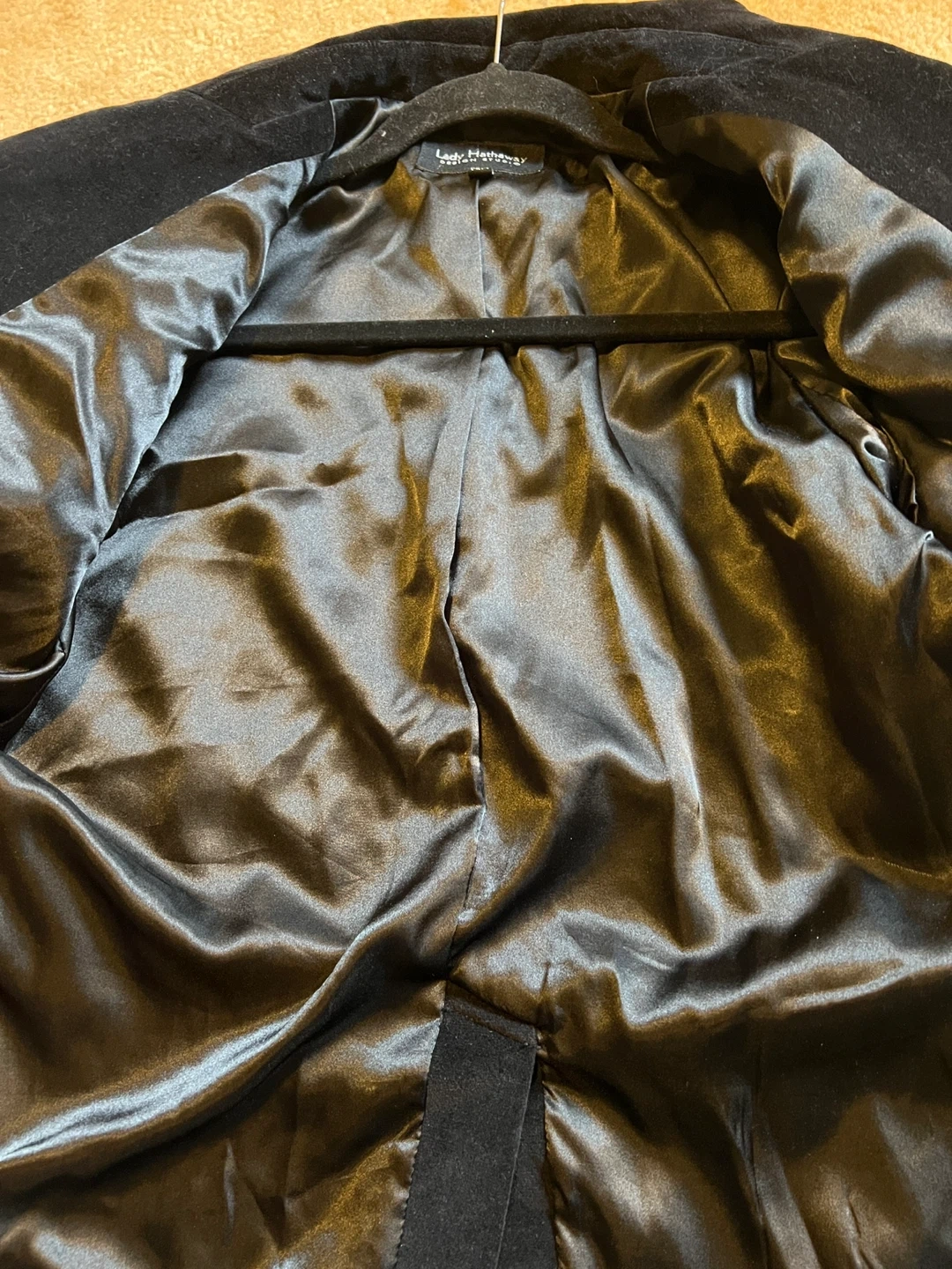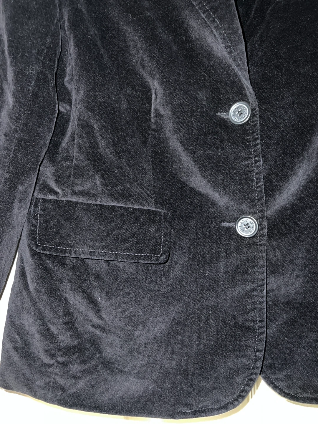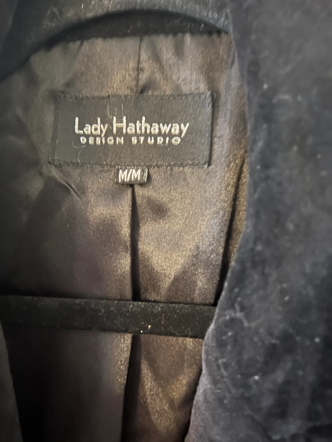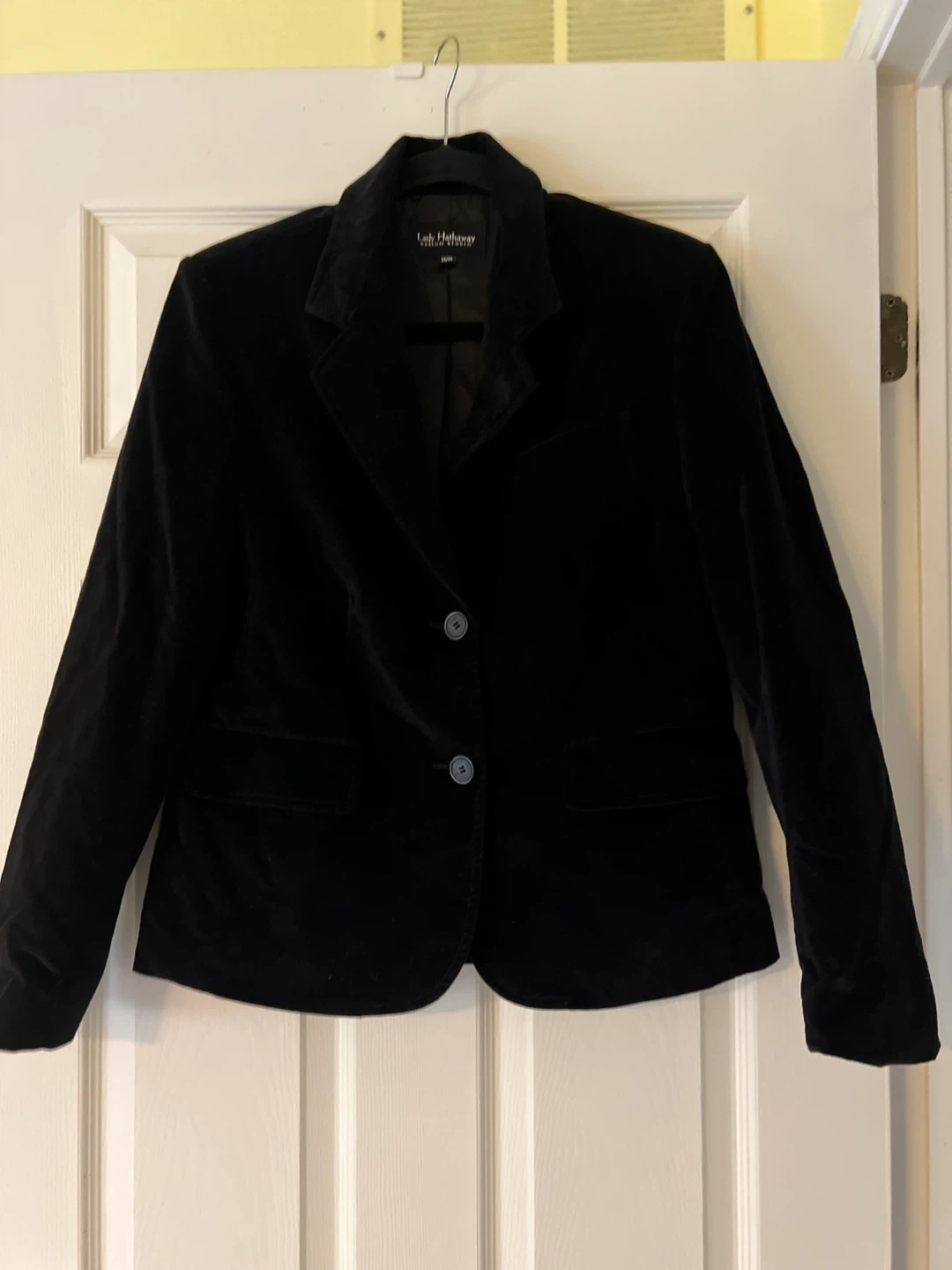 Here's a stylish black velvet blazer from Lady Hathaway Design Studio! It's a size medium and in great condition. Perfect for adding a touch of elegance to any outfit Elevate your wardrobe with this elegant black velvet blazer. Perfect for both professional and casual occasions, it offers a sleek and sophisticated look. Functional pockets Lined Has shoulder pads for structure Pit to pit 20” 2 button close Back vent In great condition Smoke free home Pick up near Glenanna Road and Hwy 2