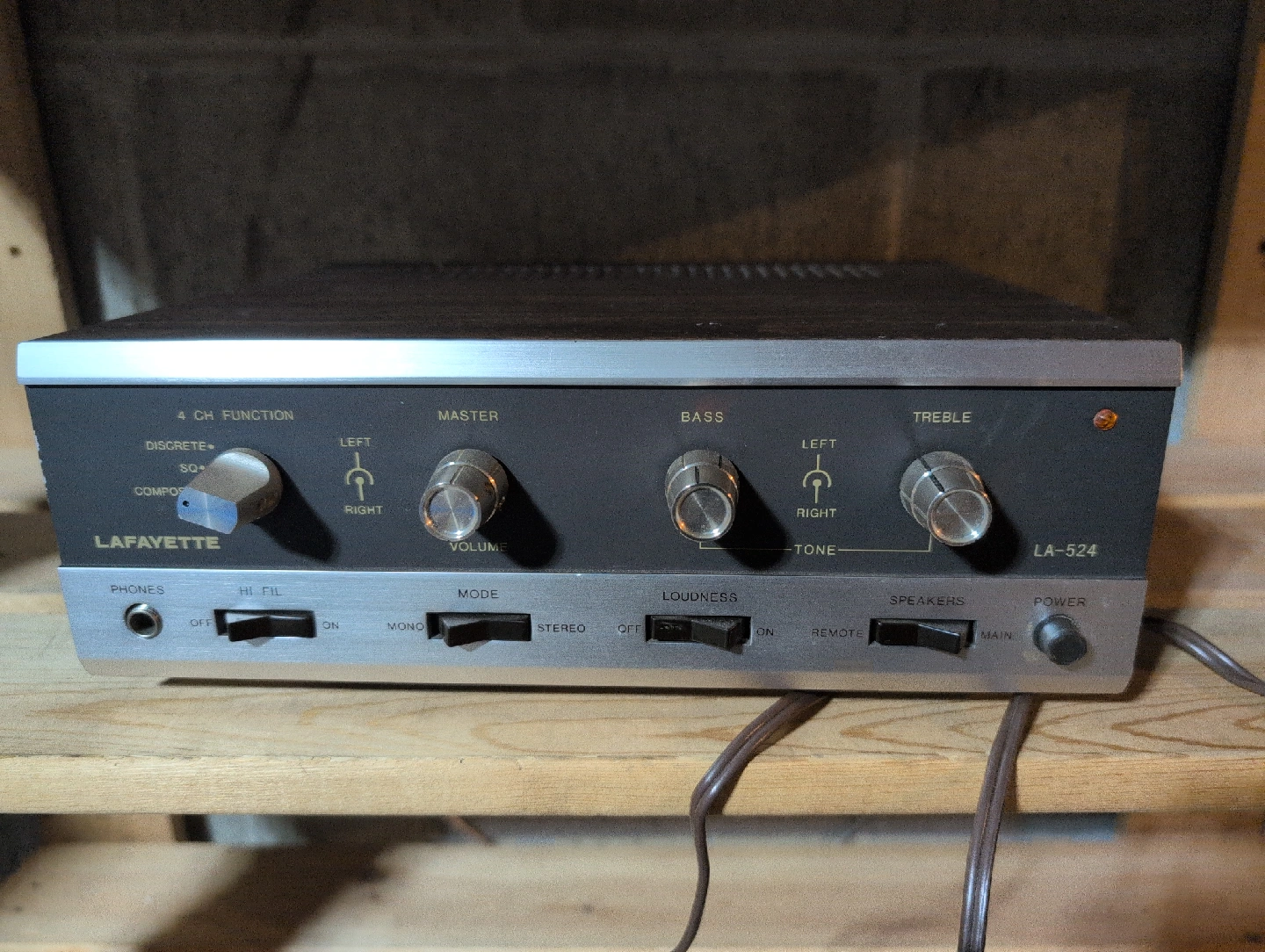 Selling a Lafayette LA-524 amplifier! It features a 4 channel function, discrete SQ compose, and controls for volume, bass, and treble. The amp also has settings for phones, hi fil, mono, mode, loudness, and speakers.