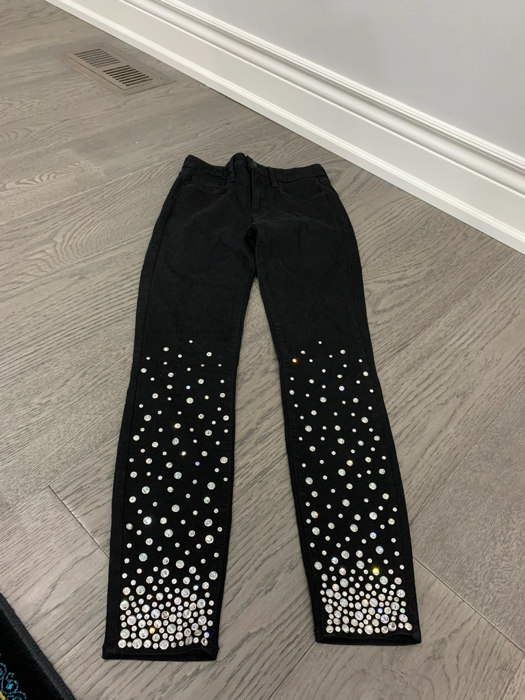 Selling a pair of L'AGENCE black jeans, size 25. These jeans have a stylish rhinestone design. The material composition is 42% cotton, 29% rayon, 19% lyocell, and 6% spandex In excellent condition!