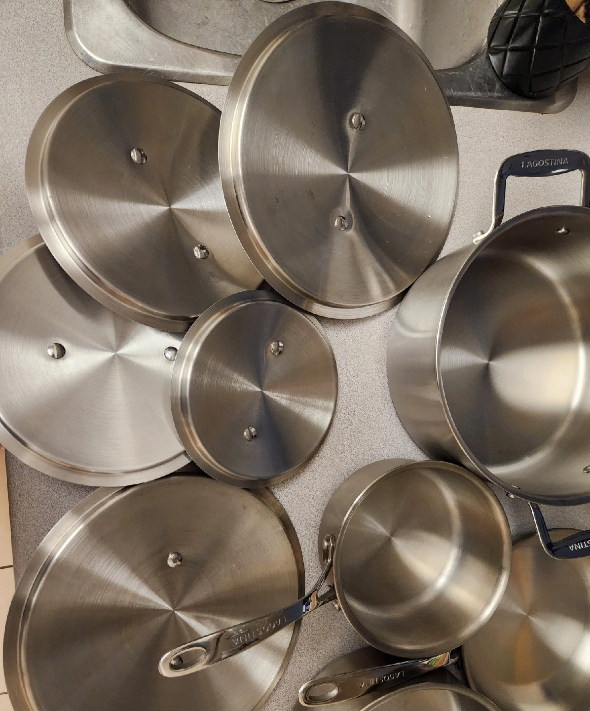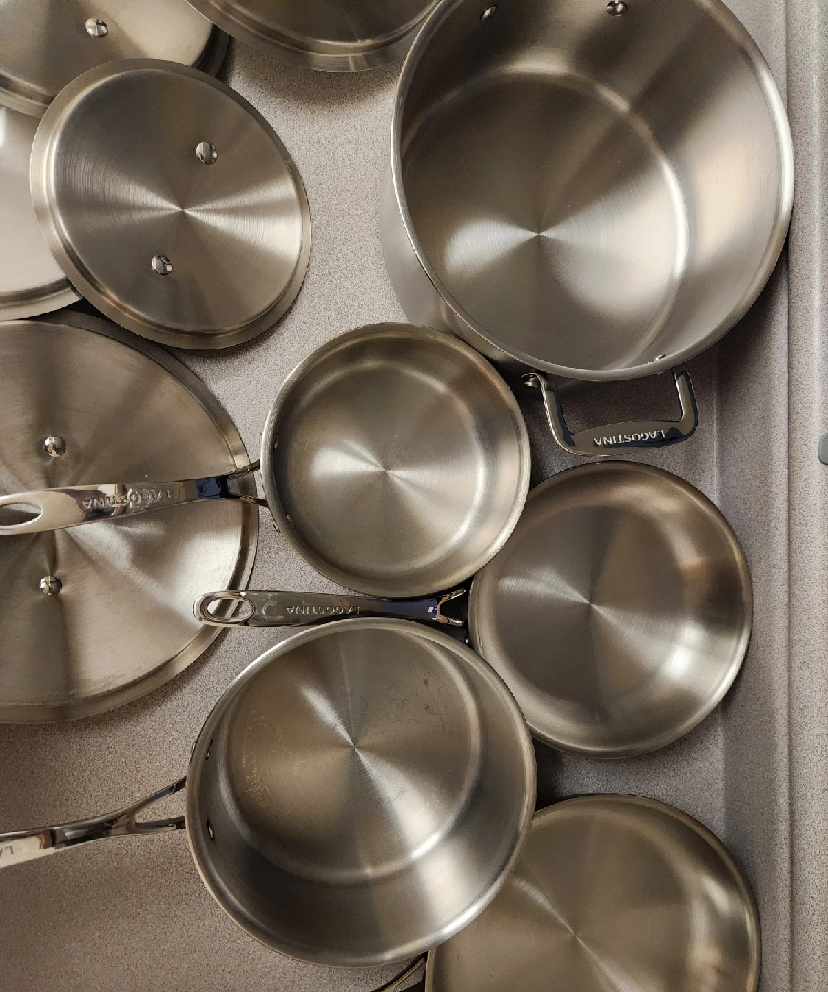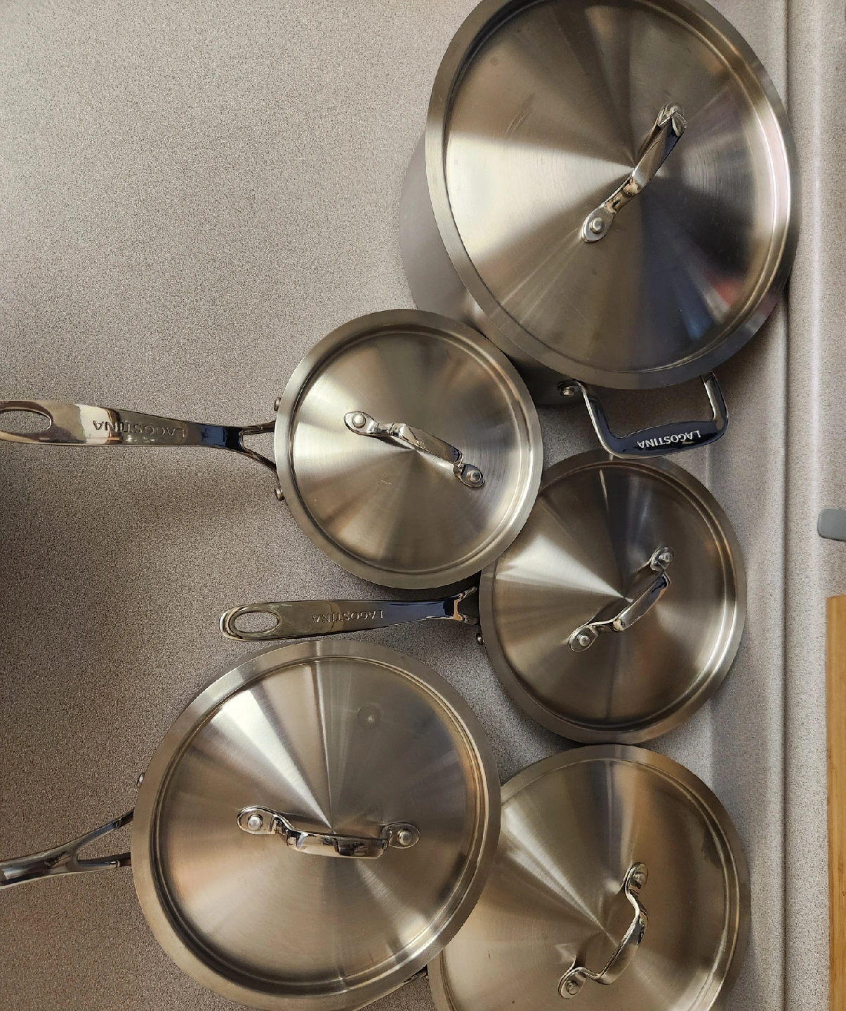 Selling a Lagostina stainless steel cookware set. It includes pots, pans, and lids. Great for any kitchen!