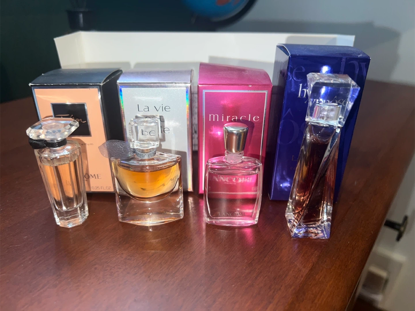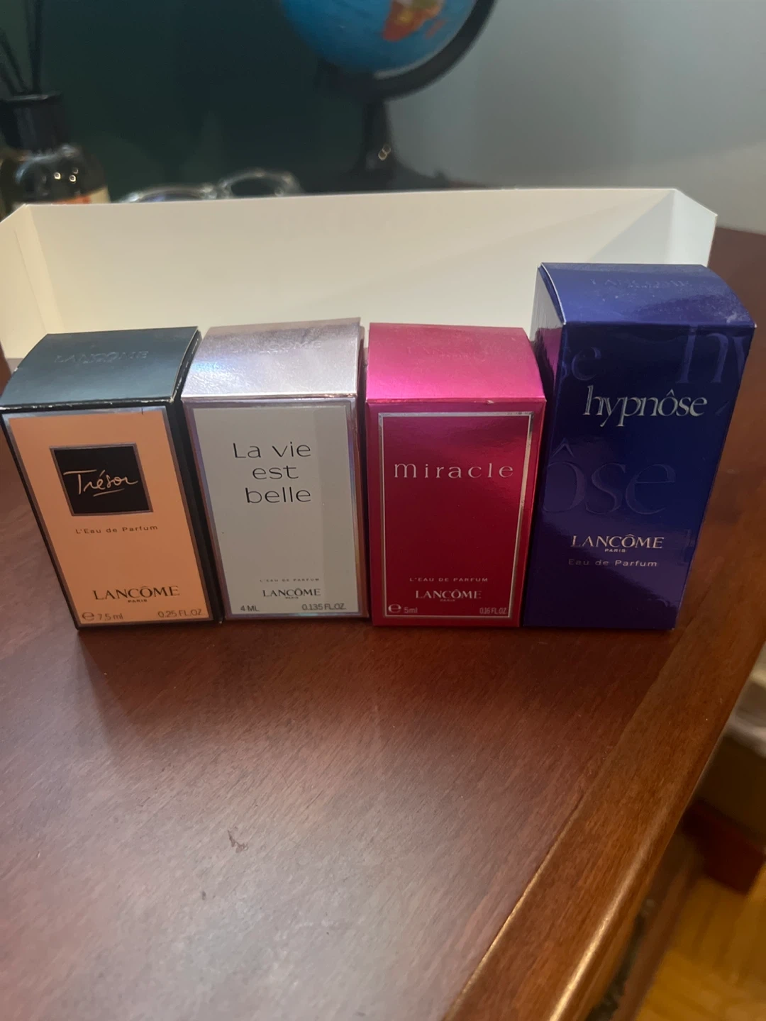 Selling a set of 4 Lancome miniature perfumes! Includes Trésor, La Vie Est Belle, Miracle, and Hypnôse. Each bottle contains 4-5ml of perfume. The set comes in its original box $50 all 4!