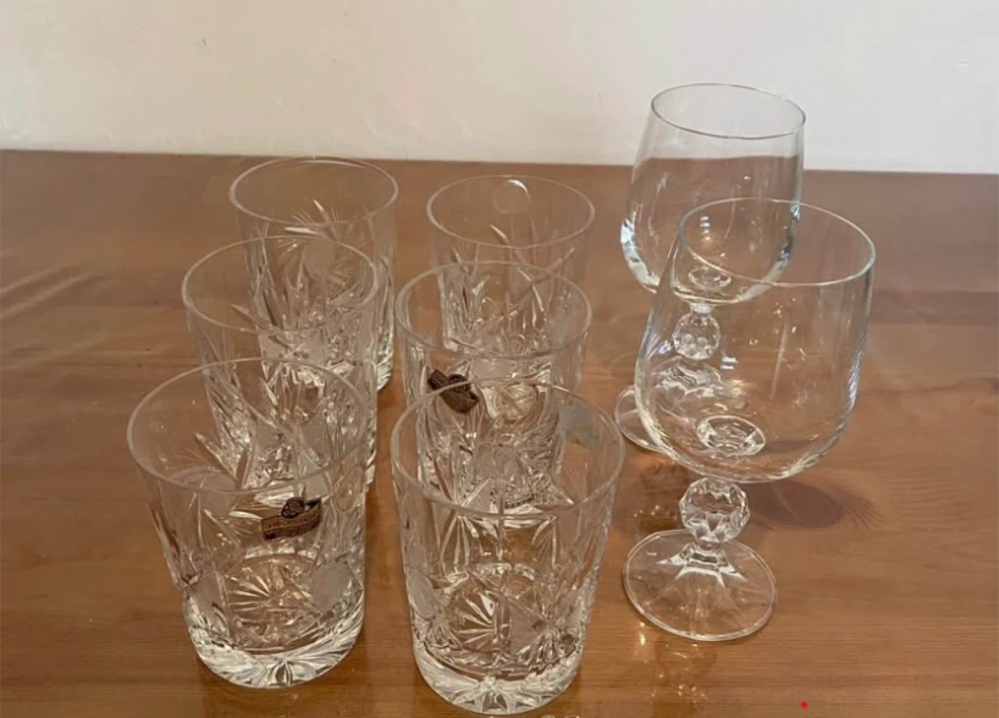 Selling a set of 8Land Crystal glasses! There are 6short glasses and 2 wine glasses. They feature a beautiful starburst pattern. Perfect for your home! Short glasses never used still have sticker on them.