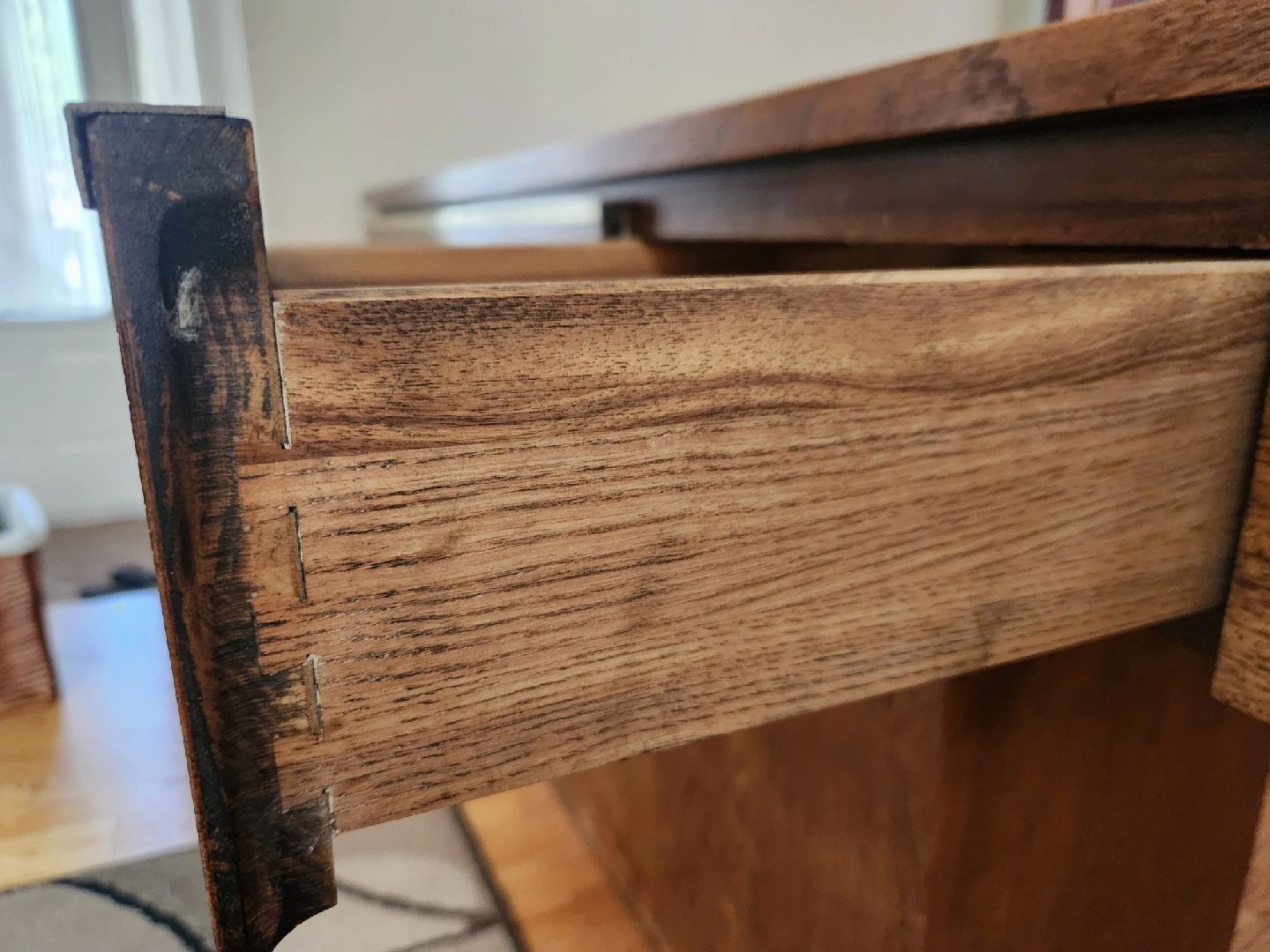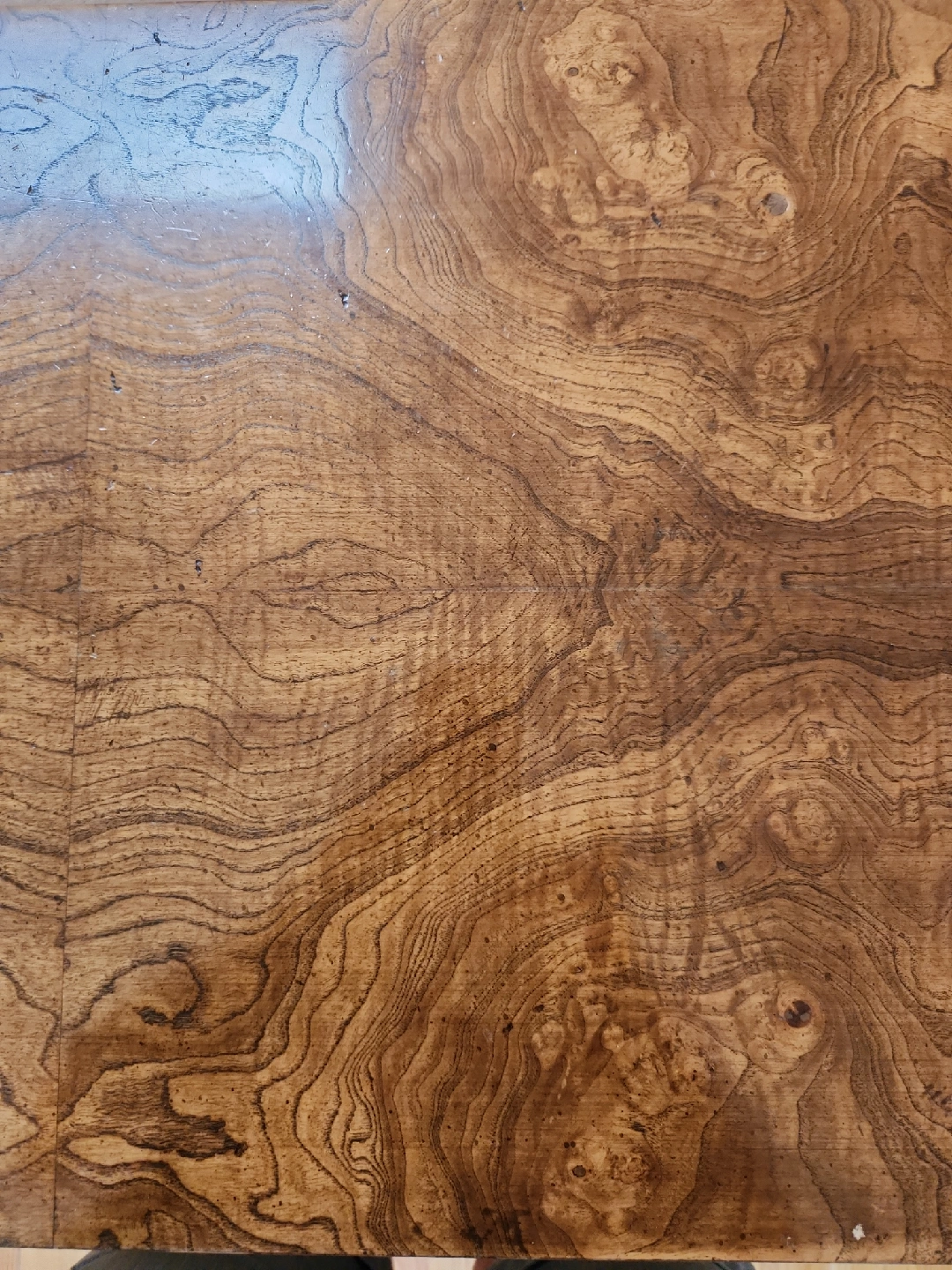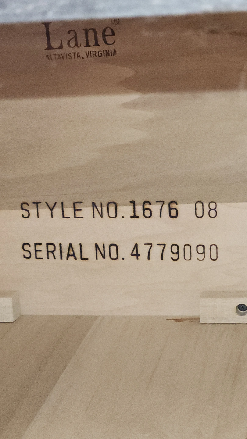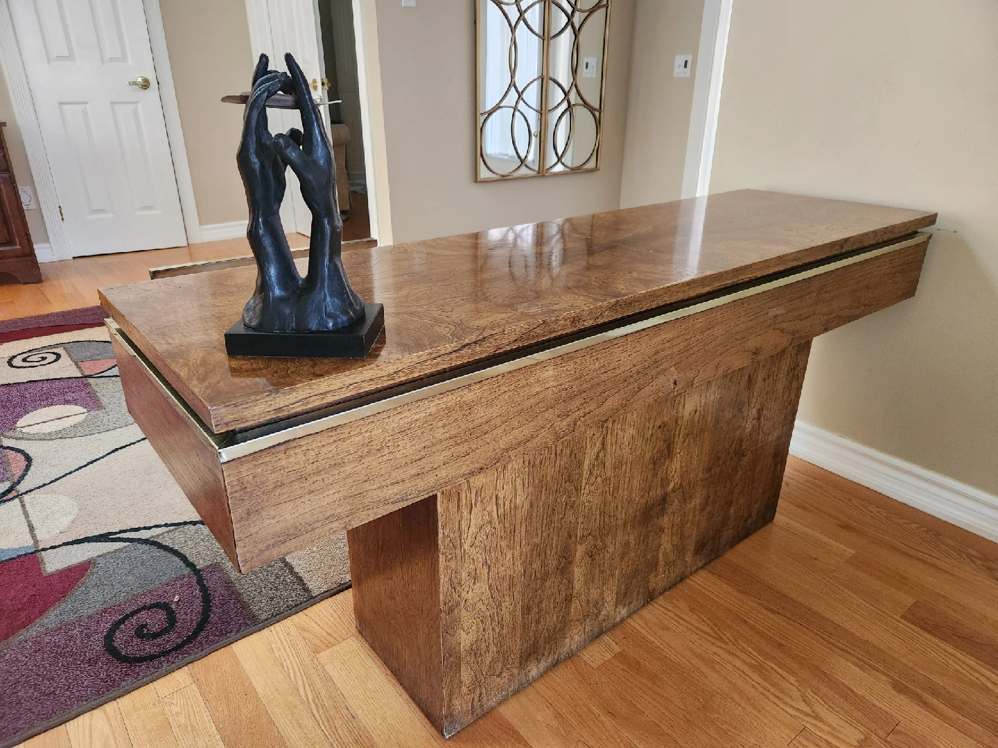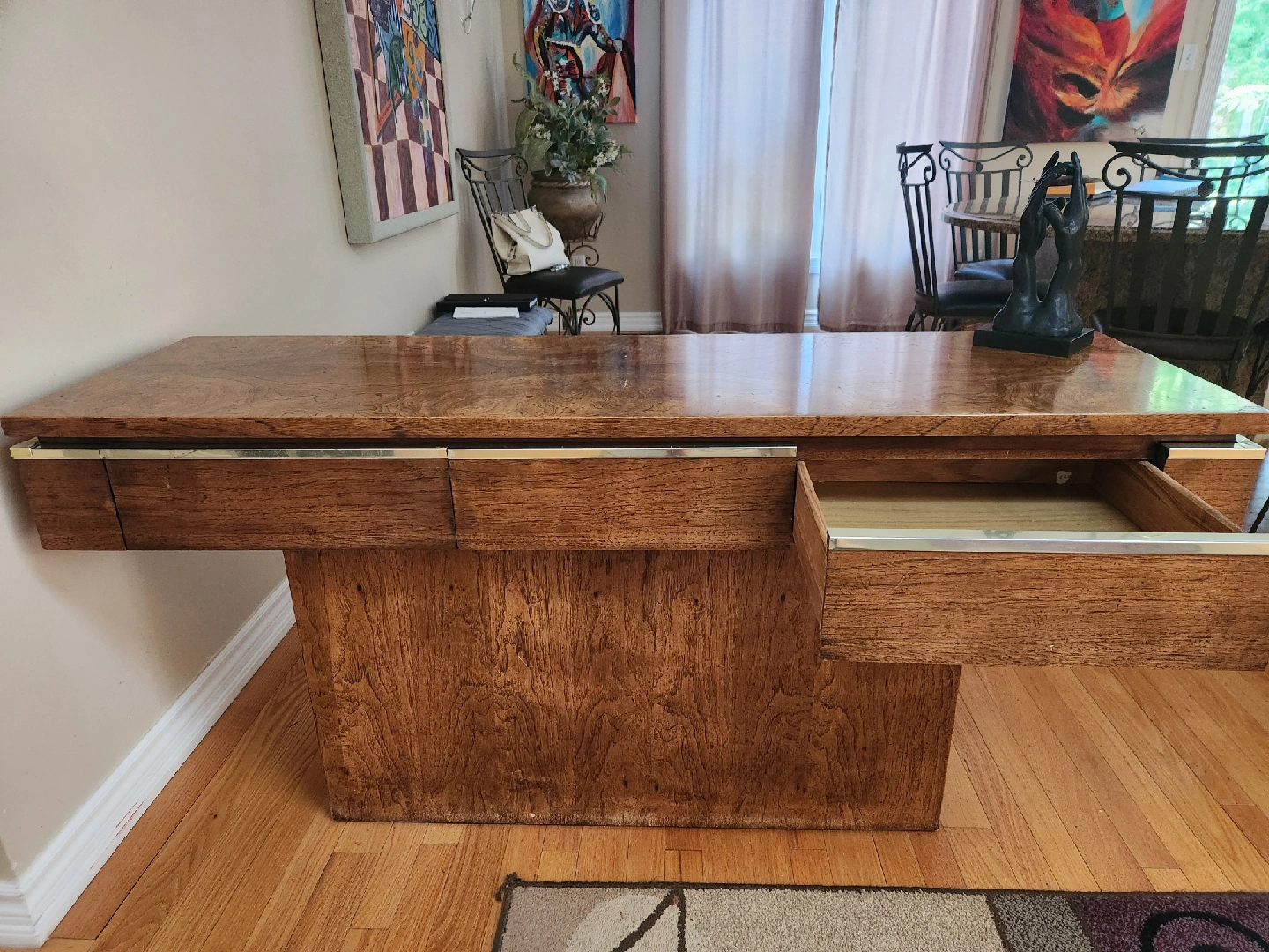 Here's a Lane Altavista Virginia desk, style number 1676. It features a beautiful wood grain pattern and a unique design. The desk has drawers for storage, making it both stylish and functional for your home office or workspace A late-1970s/early-1980s Lane Furniture piece from their Altavista, Virginia. This model (Style 1676-08, Serial 4779090) features book-matched burl oak veneer under a high-gloss lacquer, accented by a continuous brass reveal wrapping the front. The floating rectangular top houses three dovetail-joined drawers and rests on a solid central pedestal base, giving the piece its clean, architectural silhouette. Perfect as a writing desk, entryway console, or vanity. Finished on all sides, so it looks beautiful freestanding in any room. Dimensions: 5 ft length, 1.5 ft width 2.5ft height approx Pick up only