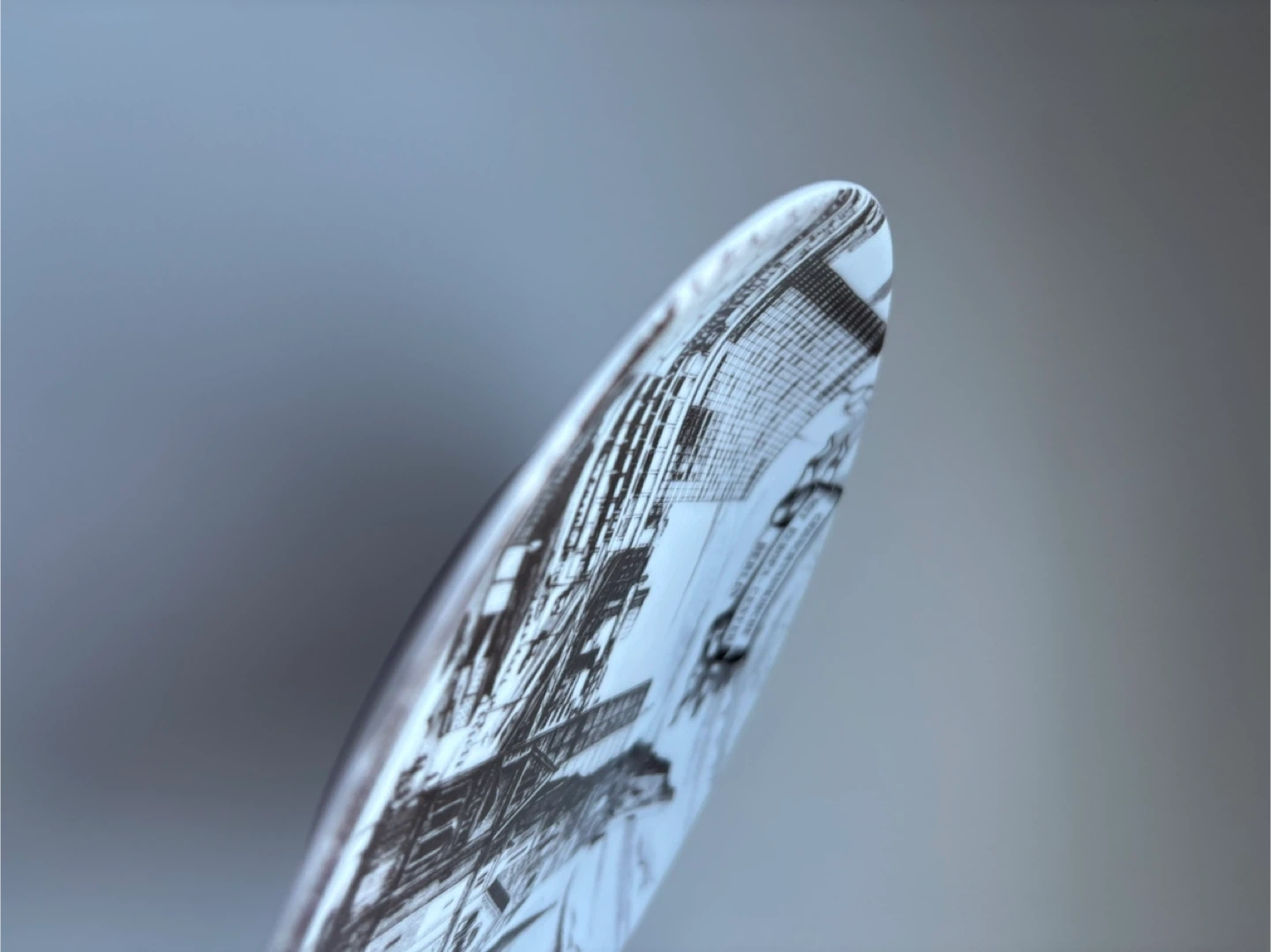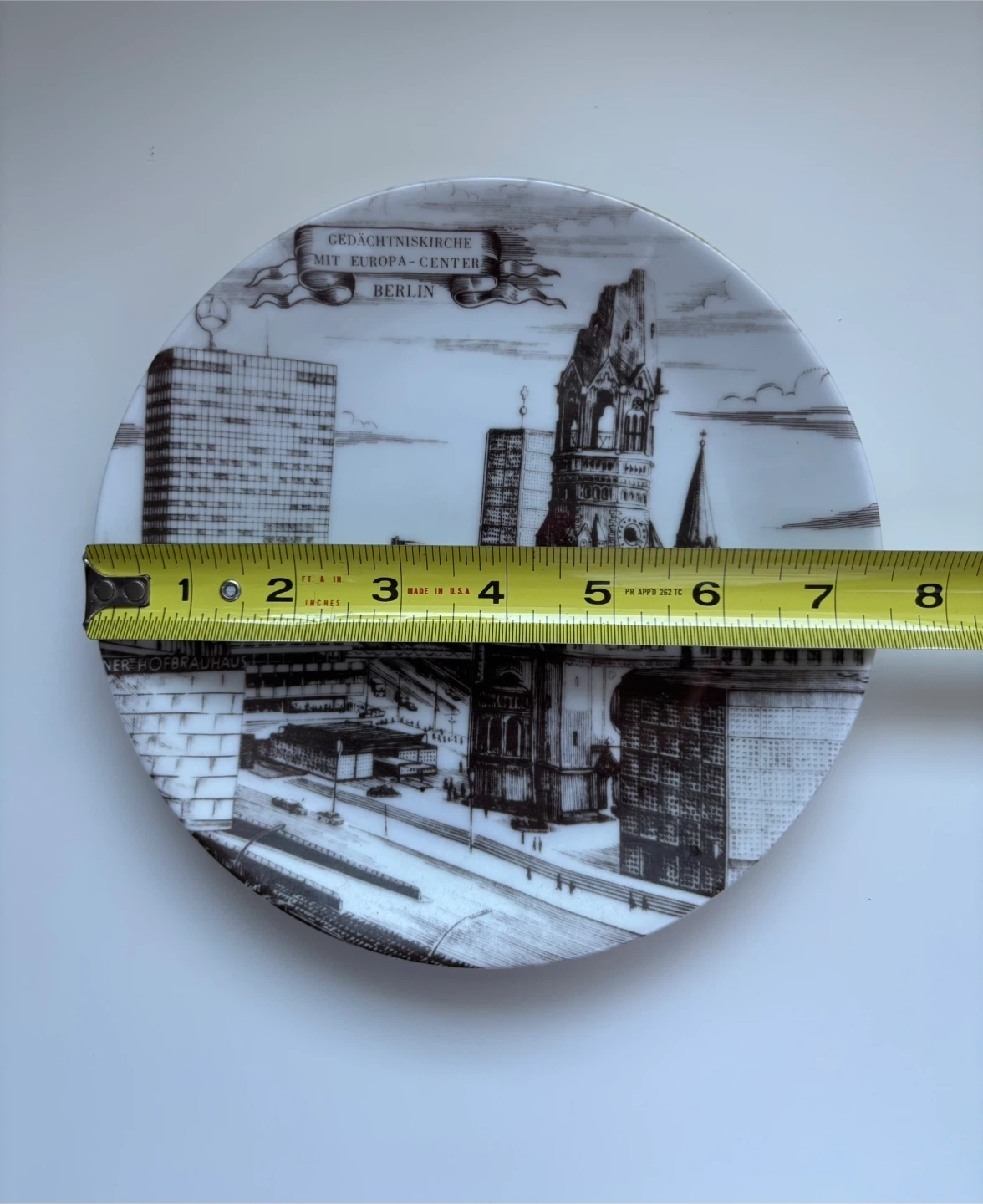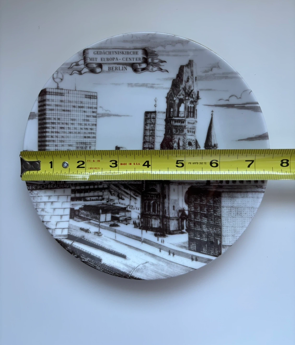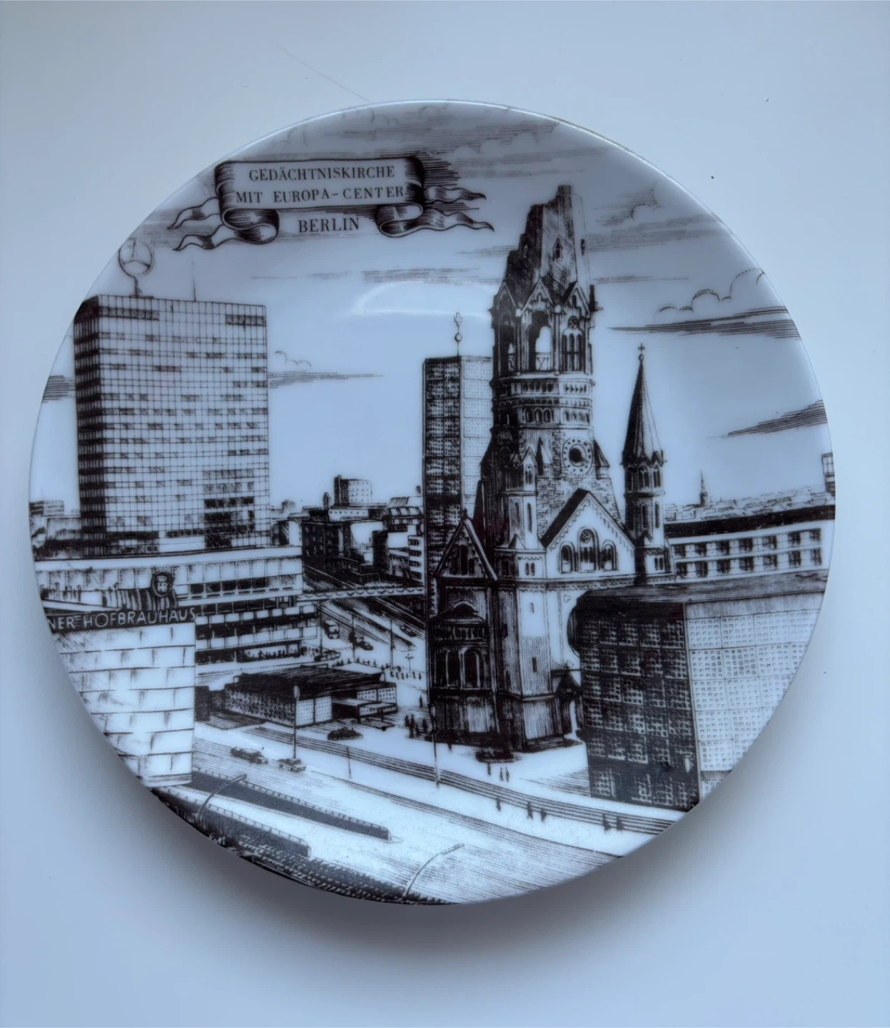 Selling a decorative plate from Lang Ebrach Bavaria. It features a black and white design of the Gedachtniskirche mit Europa-Center in Berlin. It measures approximately 7.5 inches in diameter.