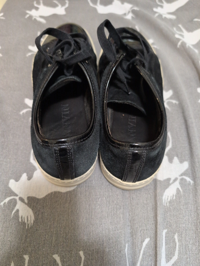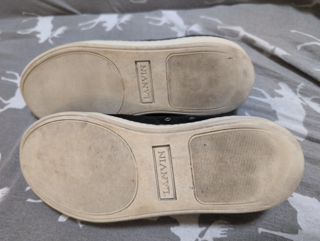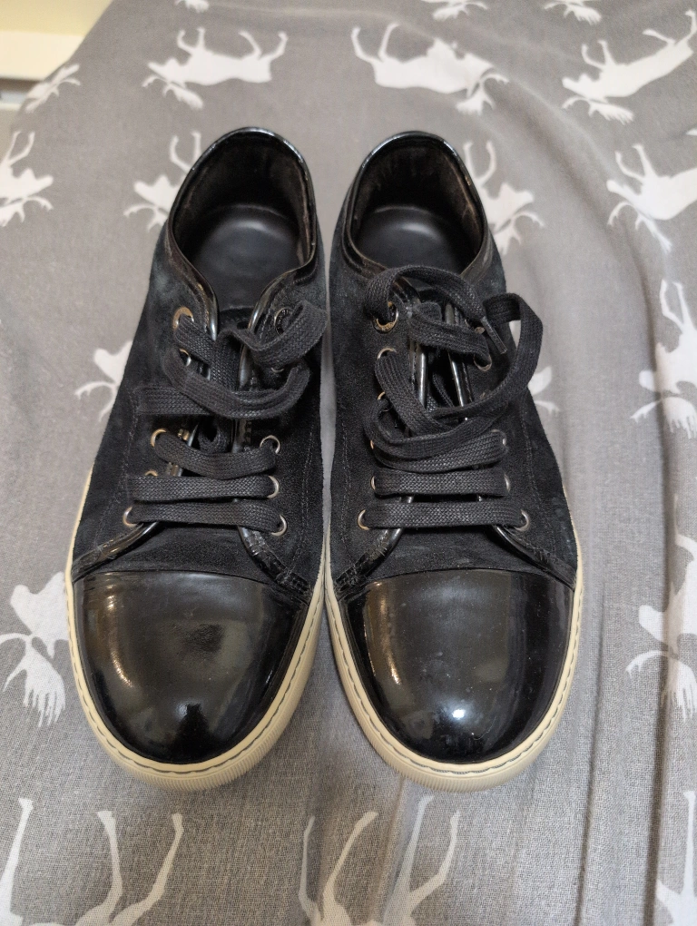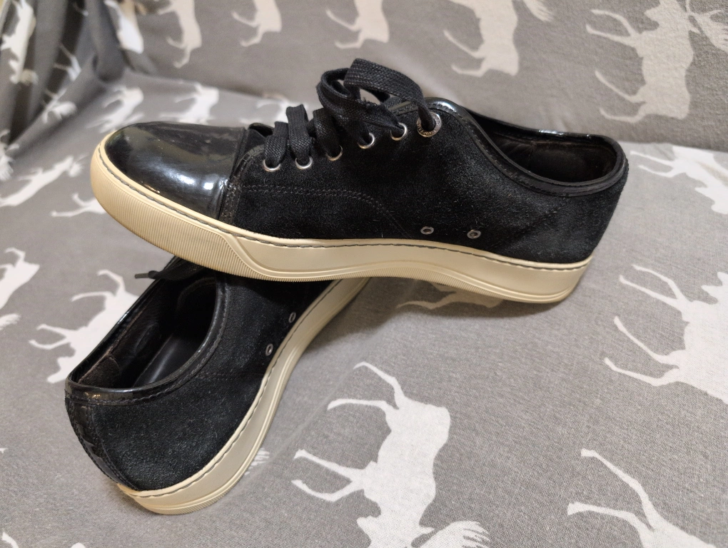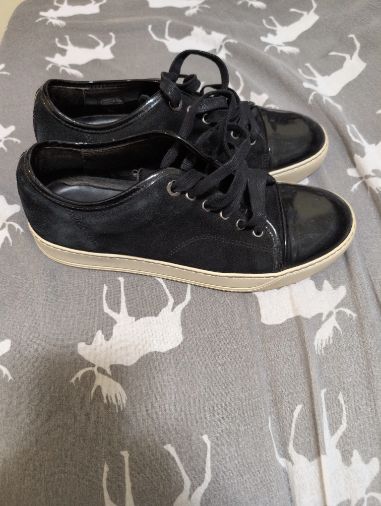 Selling a pair of gently used Lanvin sneakers. They are black and made of leather. The soles have some wear, but overall they're in good condition!