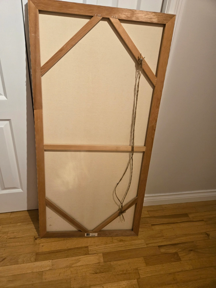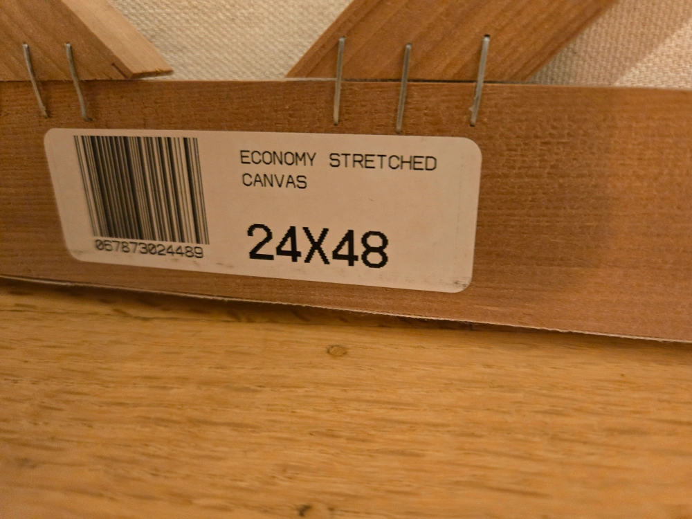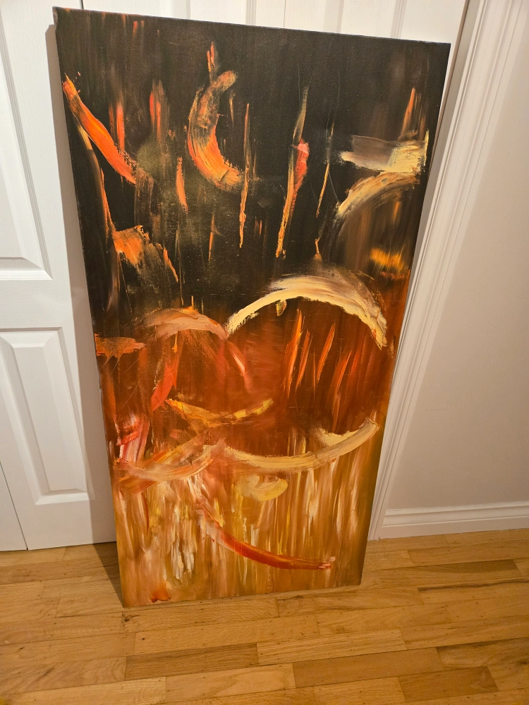 Large abstract painting on stretched canvas. Warm colours. Measurements: 24x48 inches. Economy stretched canvas.