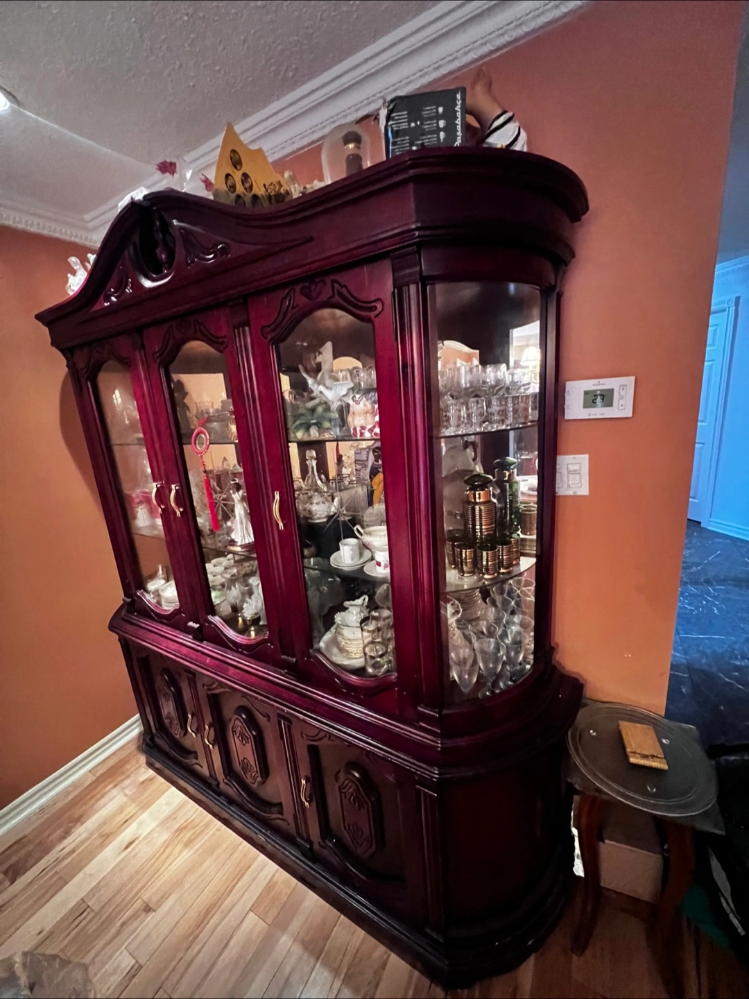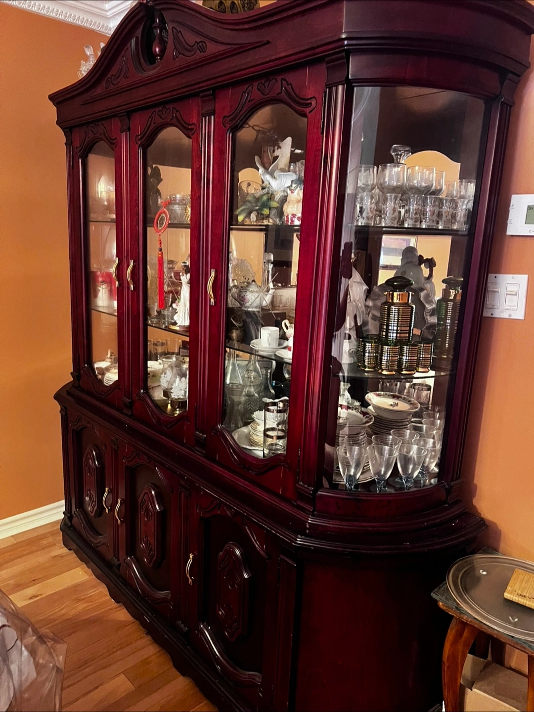 Large, dark-stained wooden china cabinet. Features glass-fronted display cabinets and lower storage. Intricate carvings and gold-toned hardware. Excellent for displaying collectibles or storing dishes. Buffet Cabinet unit - 76 wide x 20 depth x 82 height Solid wood cabinet with 3 cupboards and 3 glass doors Smoke free and pet free home. Smoke free and pet free home. Cash or etransfer payment. Pickup: Abelard ave near Steeles and McLaughlin in Brampton Moving sale: no offer refused