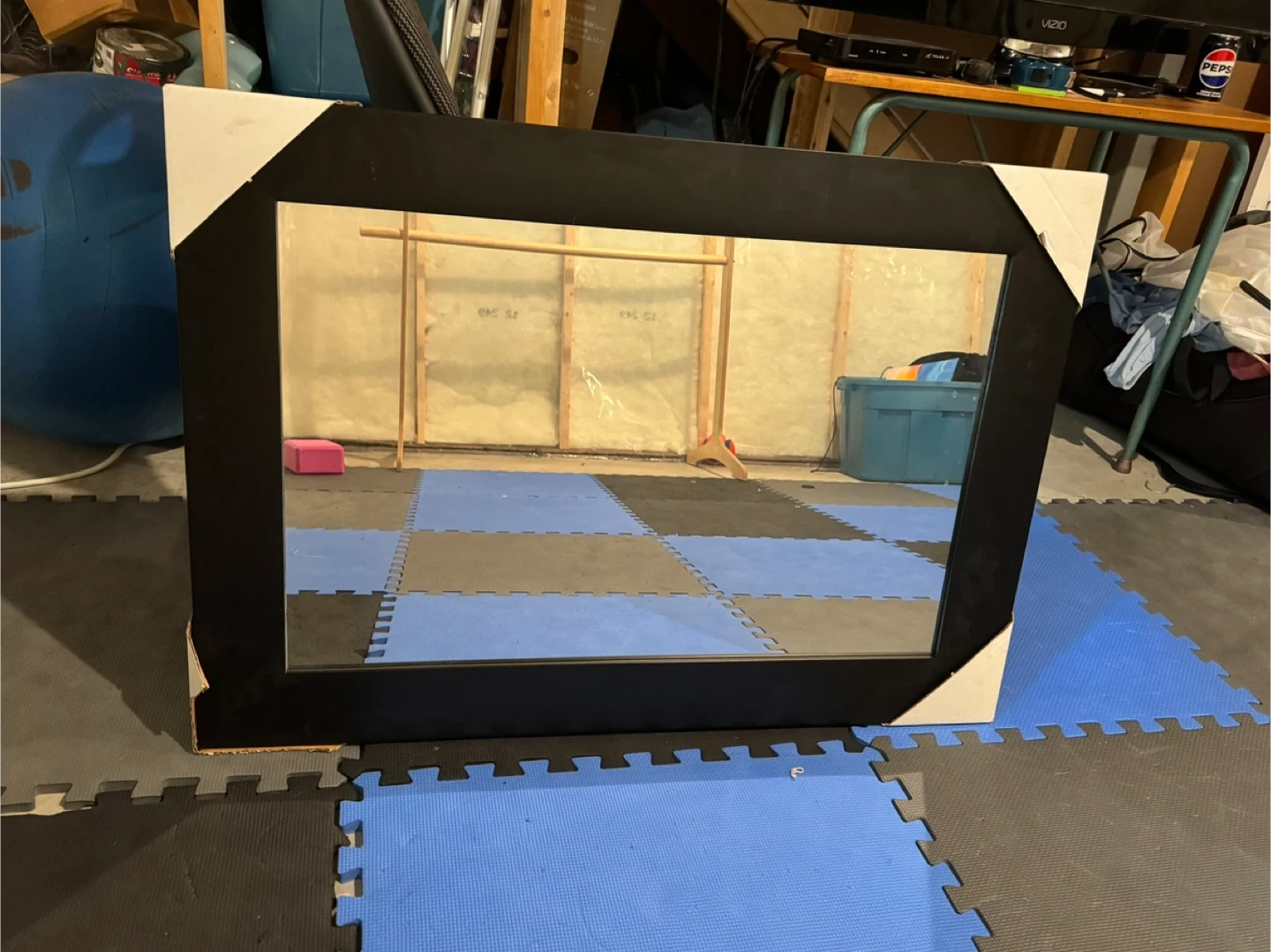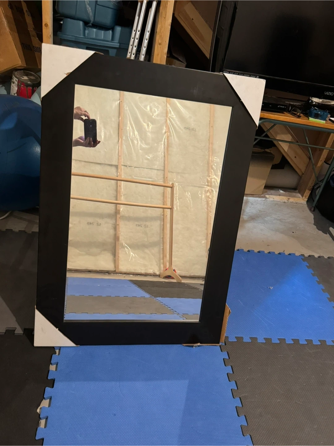 Selling a large mirror ( 27” x 38”) with a black frame. It's in new condition and ready to brighten up your space! Helping my MIL downsize - this still has the corners on. She purchased and never hung.