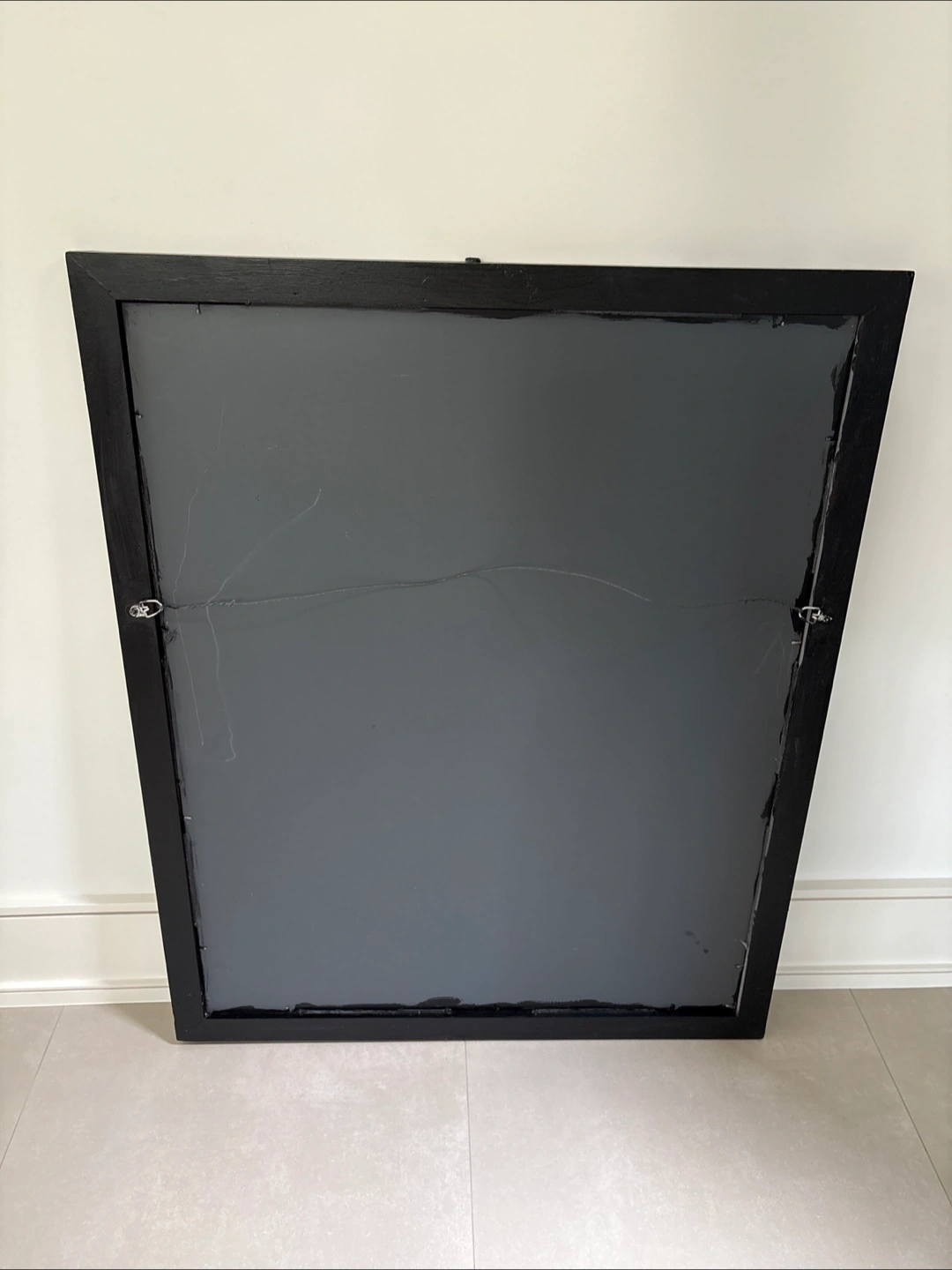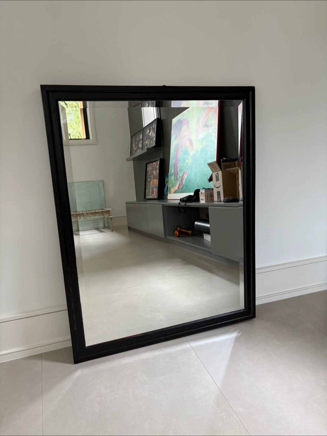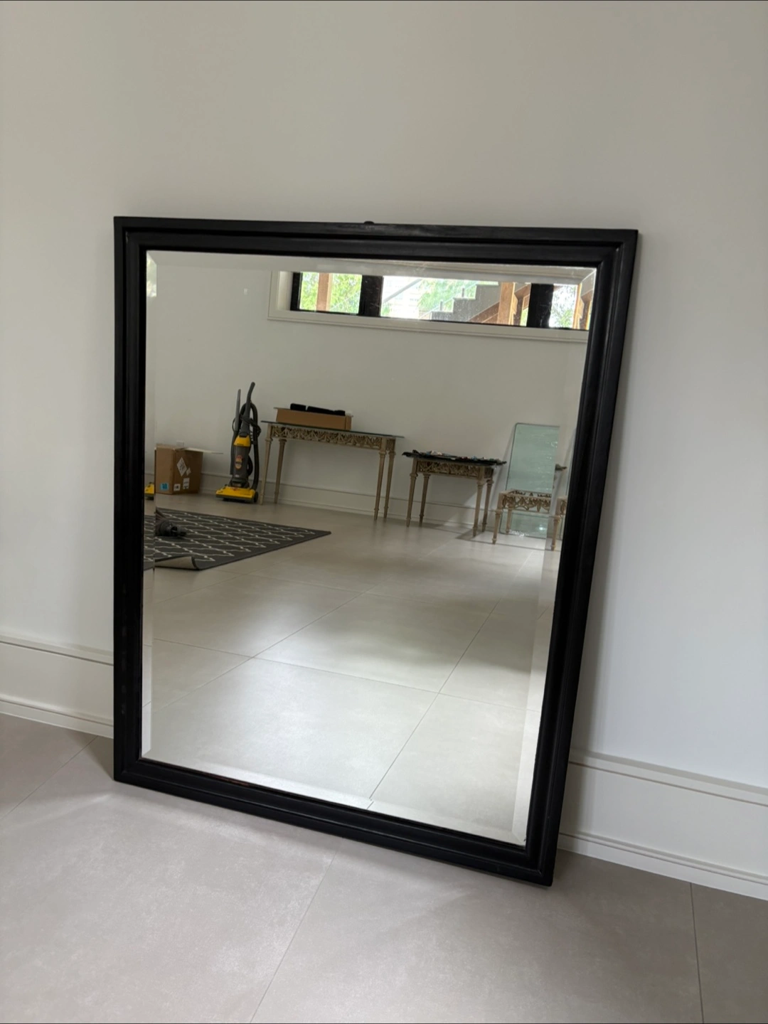 Selling a large wall mirror with a black frame. It's in great shape and ready to brighten up your space! Perfect for a living room, bedroom, or entryway. It's a solid piece and adds a touch of elegance to any room 86 cm by 106 cm by 2.5 cm