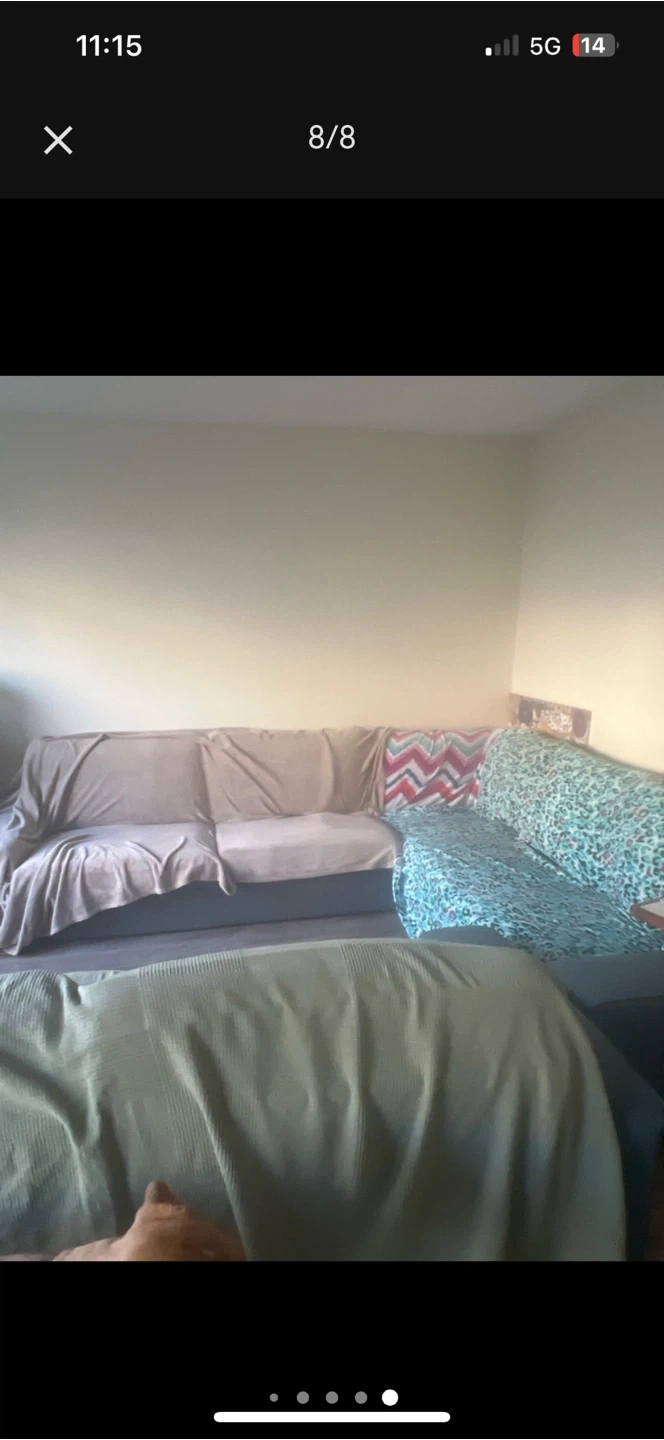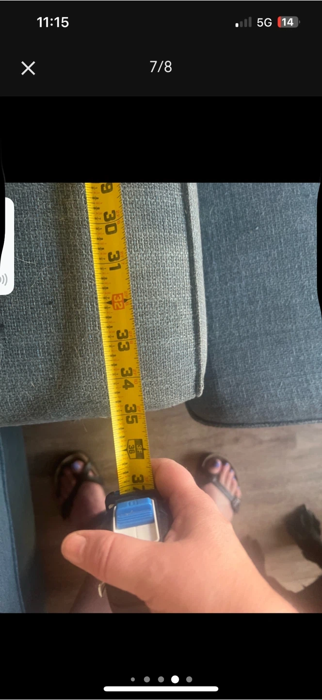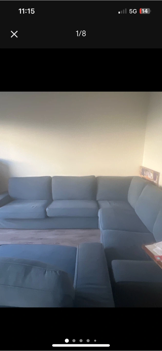 Selling a large sectional sofa in a nice blue colour. It's in good condition and would be perfect for a living room or family room. The tape measure in one of the photos shows that the height is around 36 inches. It's a comfortable and stylish piece of furniture!