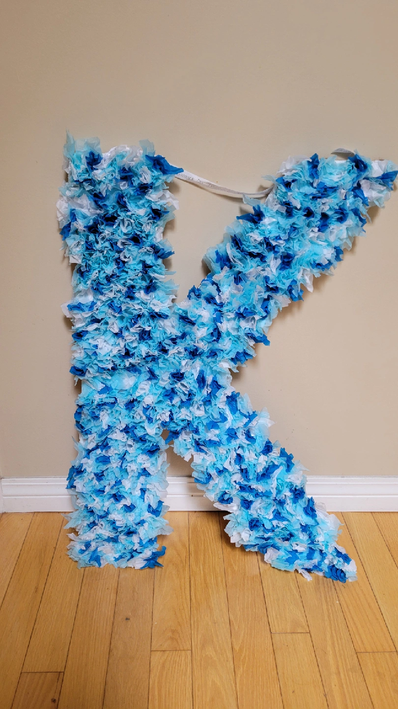 Add a personal touch to any room with this decorative letter 'K'! It's made of blue and white tissue paper. Perfect for a nursery, child's room, or party decoration