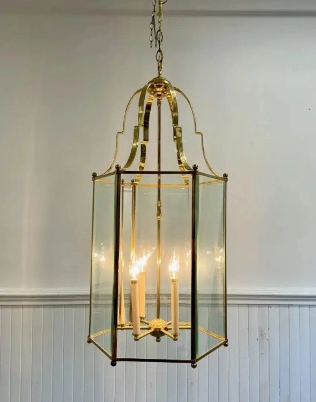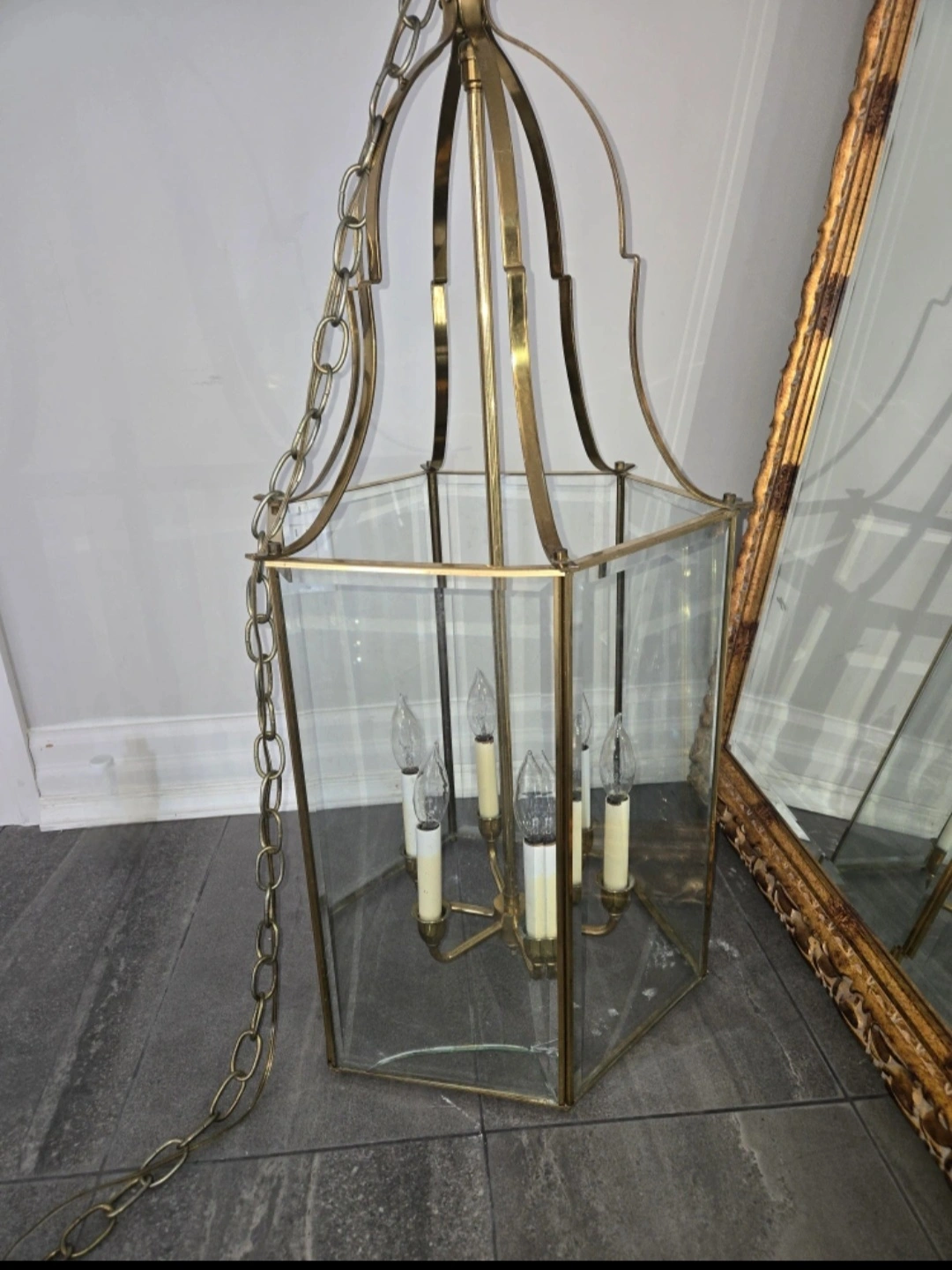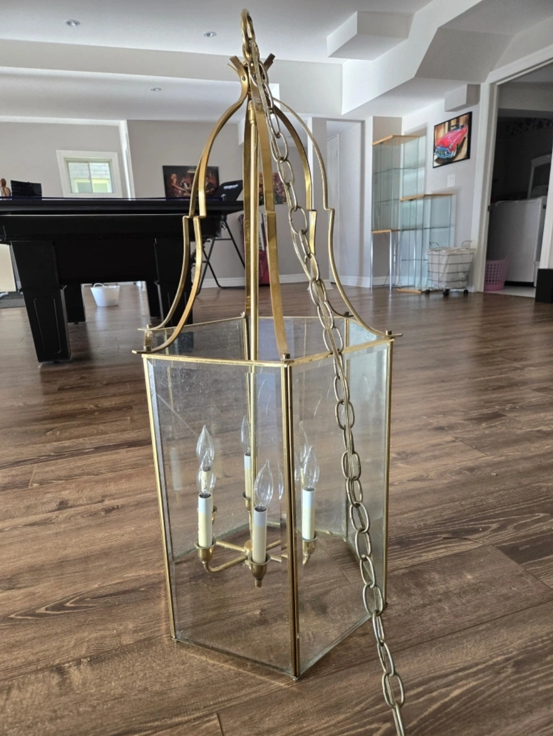 Selling a large brass portico/hall pendant light fixture. It's a newer light fixture with 6 large panes in a brass polished frame. The dimensions are 18" diameter x 36 1/2" tall fixture, 76 1/2" overall. Originally bought for $275 * One glass pane is cracked- price reflects- you can either replace the glass or remove all of them