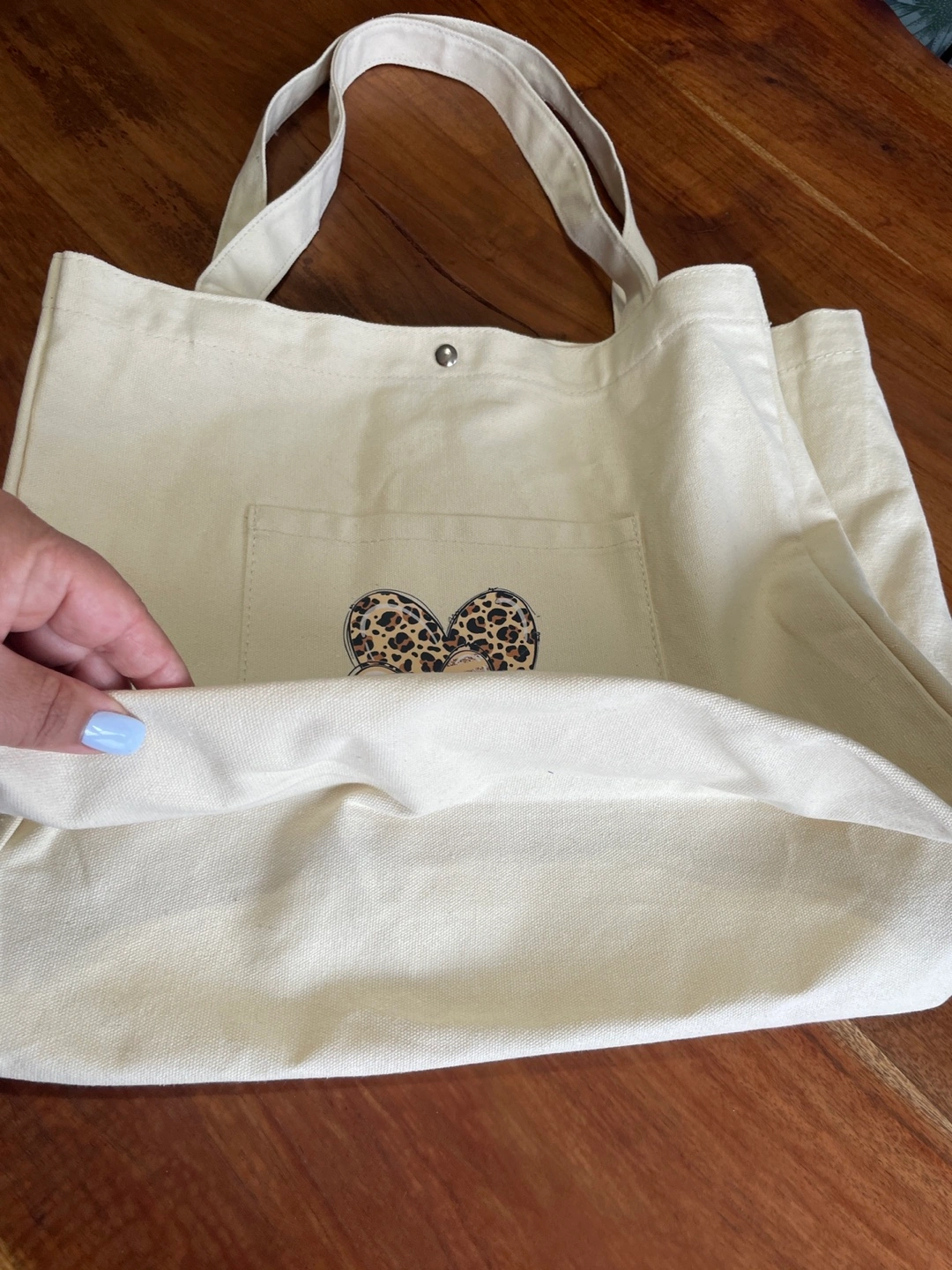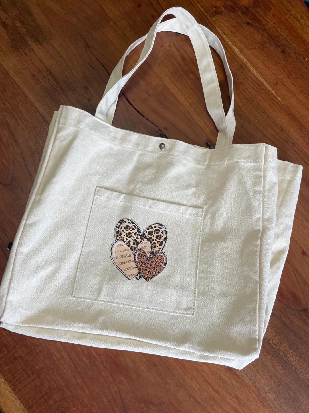 Off-white canvas tote bag. Features a front pocket with a design of three overlapping hearts. Two hearts are leopard print, one has a striped pattern. Simple design, great for everyday use.