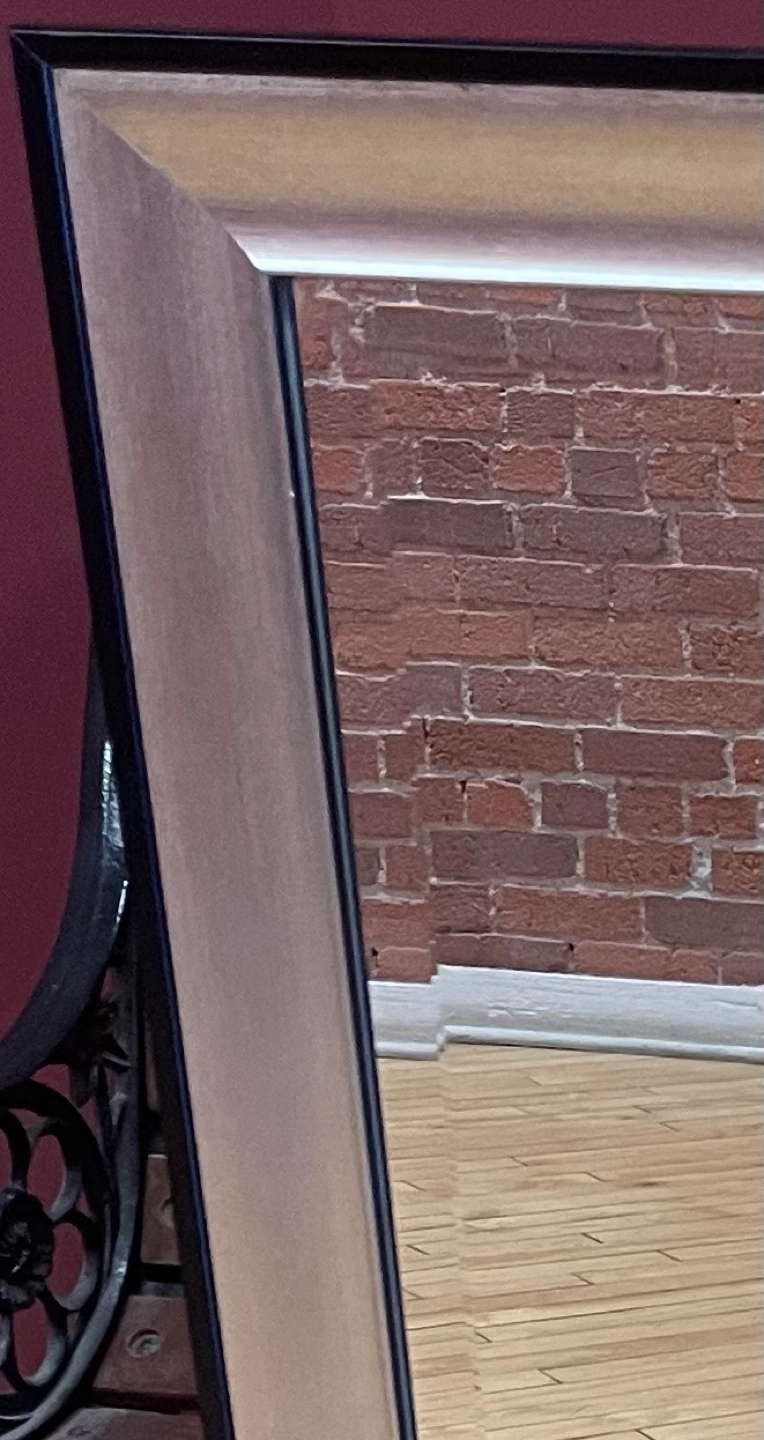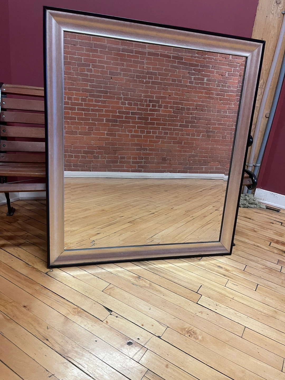 Elegant rectangular mirror. Features a wide frame, beveled edge, a black outer edge and a brushed silver frame. 40x36, and has mounts to hang mirror either way. Perfect for a bedroom, living room, or entryway. Good condition.