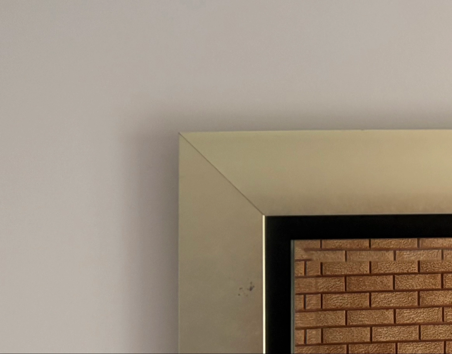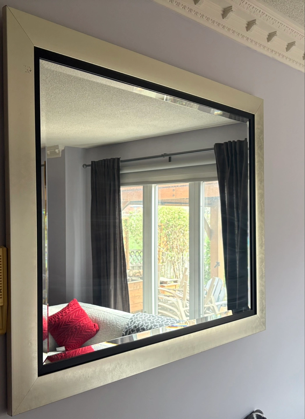 Large wall mirror. Features a silver and black frame. Great for adding light and style to any room. Pre-owned.