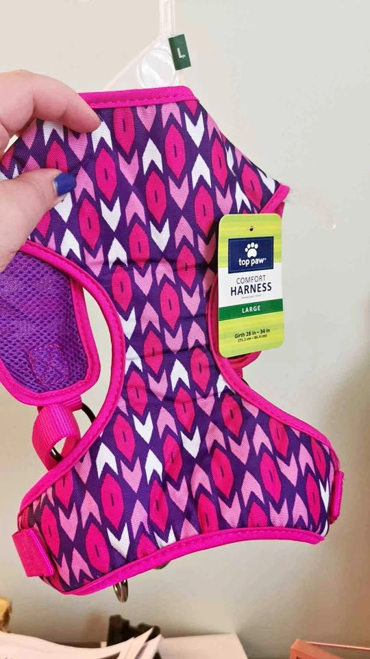 Brand new, never used dog harness with a pink and purple pattern. From Top Paw, easy to use and clip. Fits the chest girth of 28 inches - 34 inches for dogs.