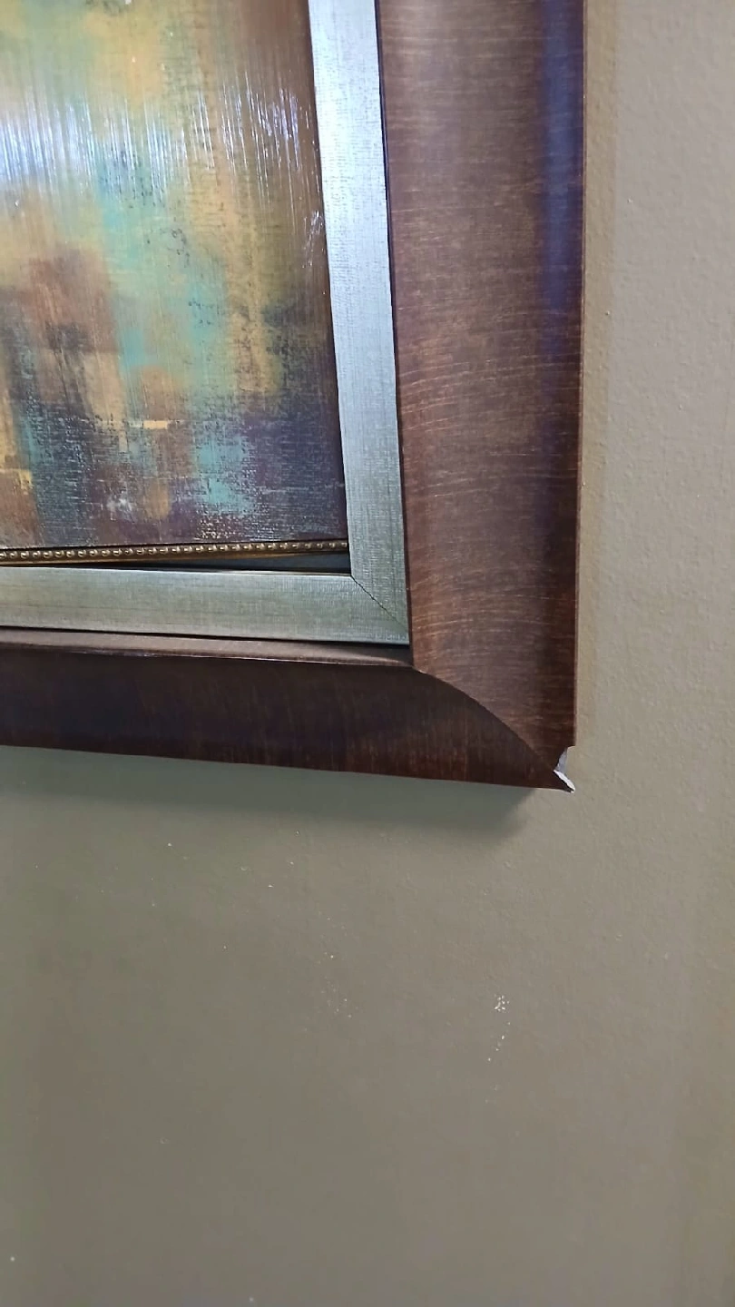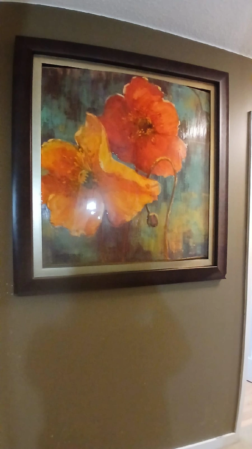 Beautiful floral painting with vibrant orange and yellow flowers set against a teal and yellow background. The painting is framed in a dark wooden frame with a gold inner border. Approx. 1x 1m (3 x 3 ft) It's a lovely piece to brighten up any room!