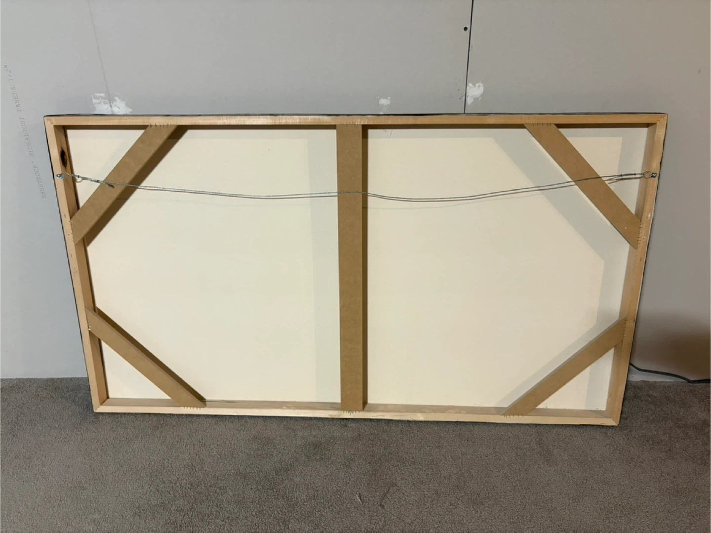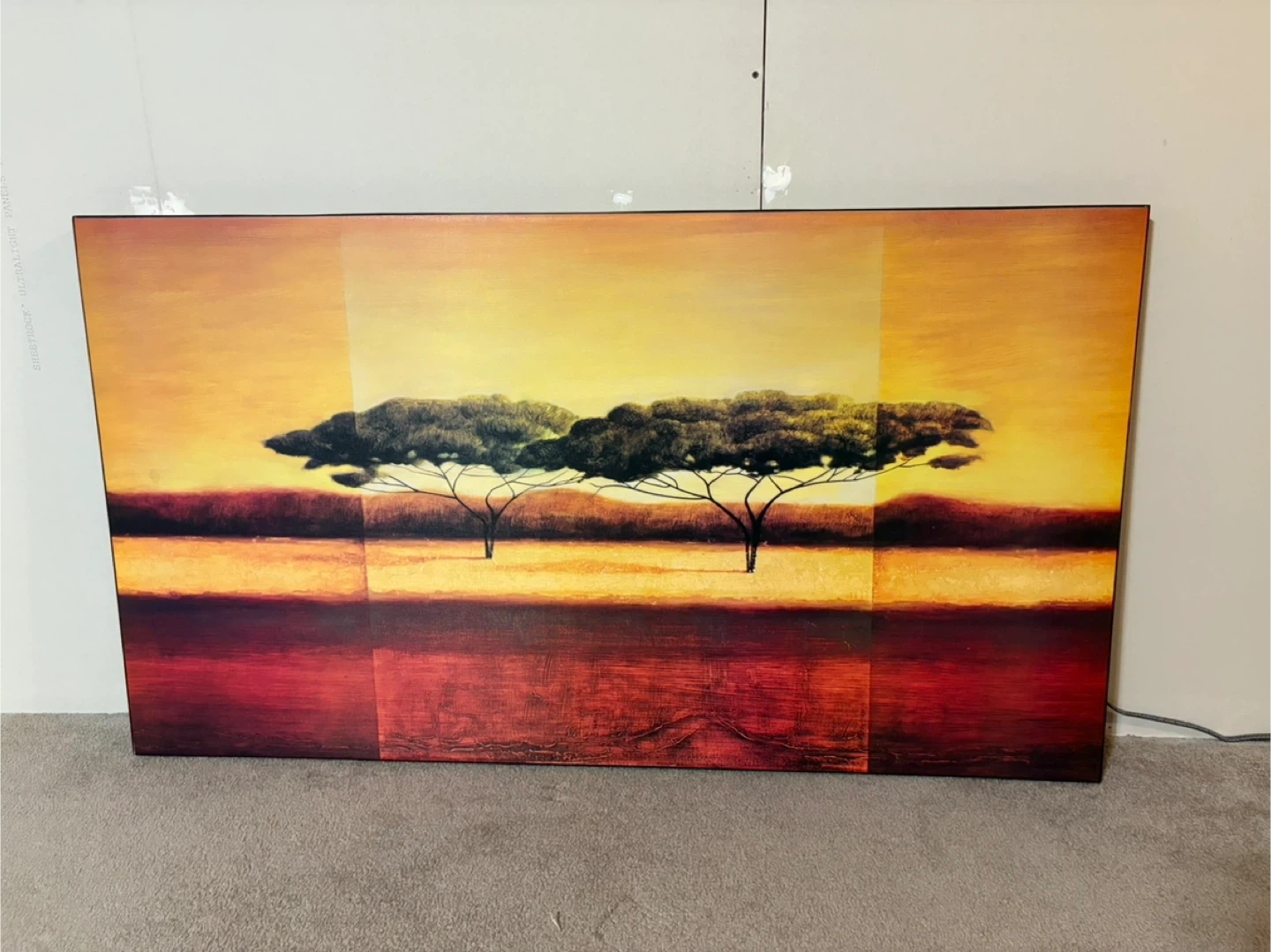 Beautiful framed landscape painting featuring trees against a warm, sunset-like backdrop. It's a large piece, perfect for adding a touch of nature to your living room or office. The frame is sturdy and the painting is in great condition!