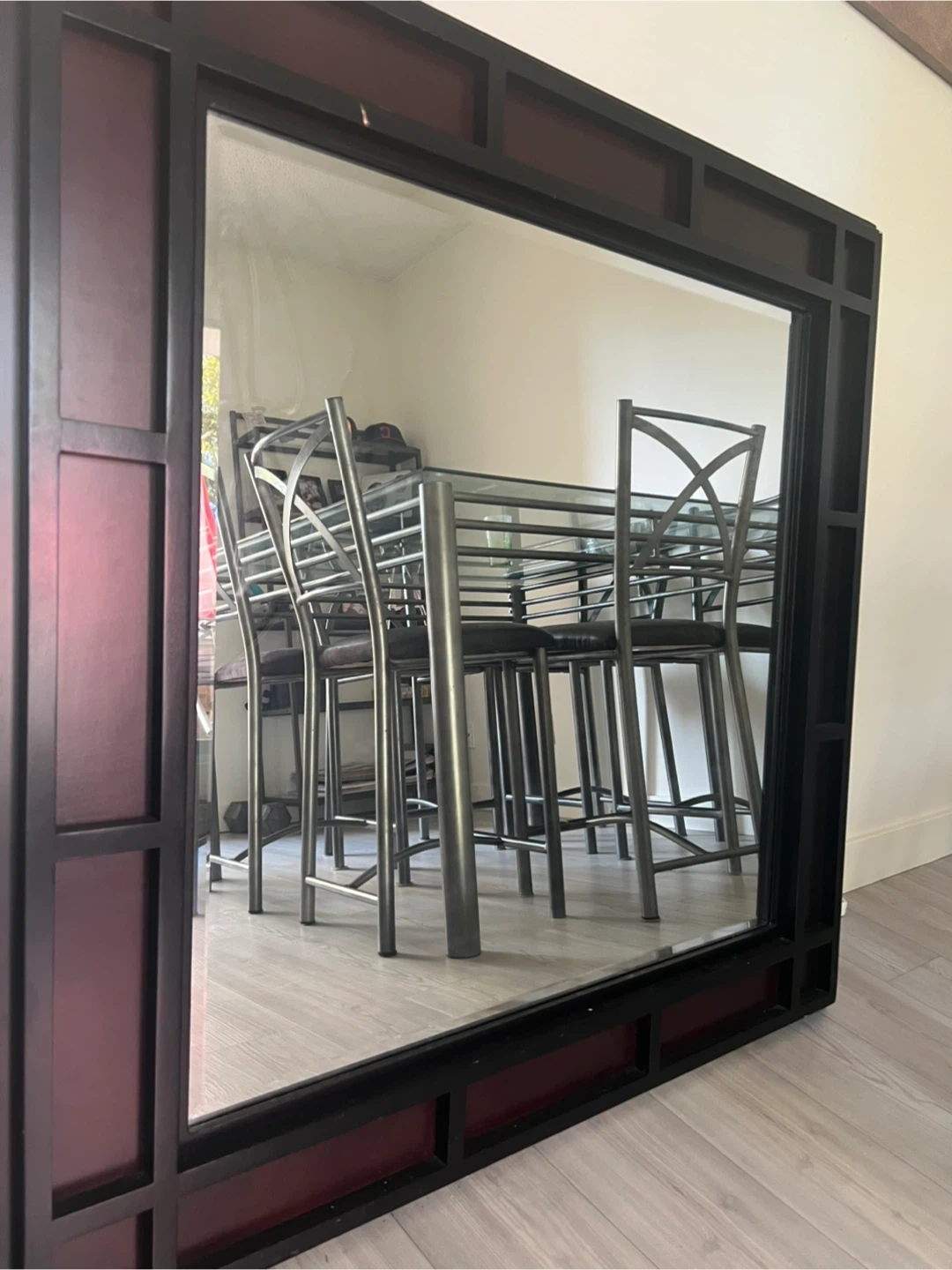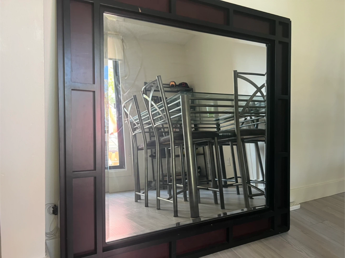 Selling a large framed wall mirror. The frame is a dark brown/black colour and has a unique design. It's in great condition and would look lovely in any room of the house! Over 100 bucks when I brought it in ikea delivery is free