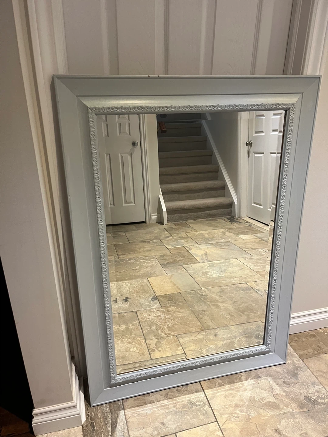 Selling a large mirror with a grey frame. It's in great shape and would look lovely in any room! The frame has a decorative edge, adding a touch of elegance. Perfect for an entryway, bedroom, or living room
