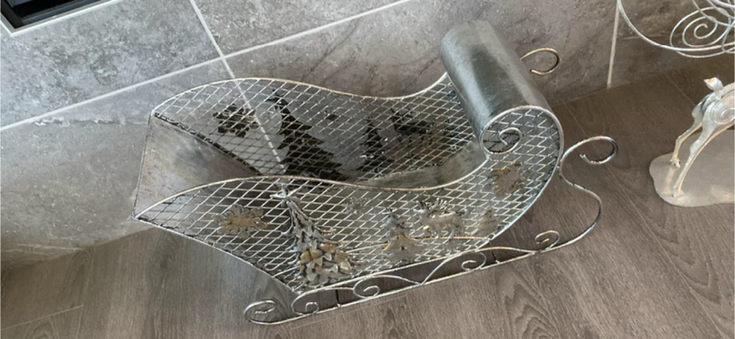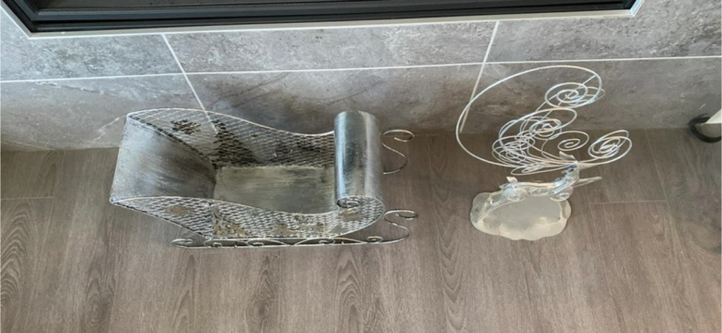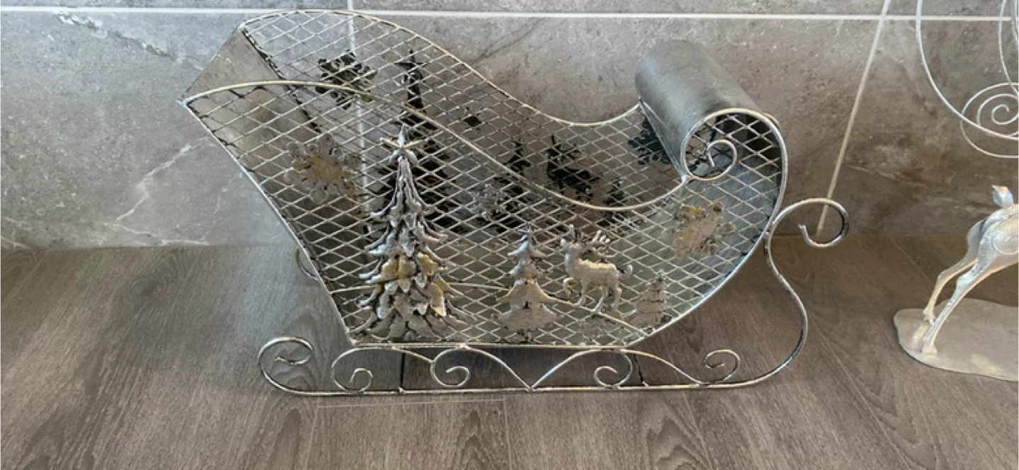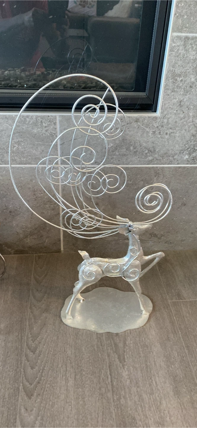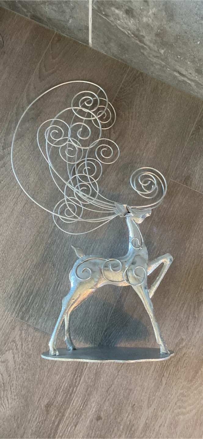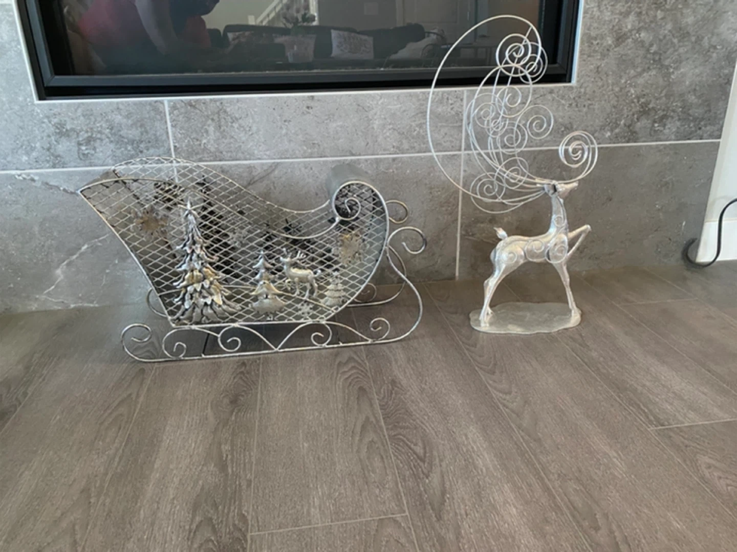 Like New - Selling a cute set of Christmas decorations! It includes a large metal silver sleigh with a mesh design and a large metal reindeer figure. Perfect for adding a festive touch to your home during the holidays