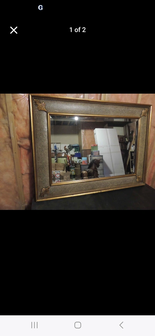 Selling a large mirror with an ornate gold frame. It's in good condition and would look great in any room! The frame has a textured pattern with leaf details in the corners. High quality 48" x 36" Beveled Mirror. It was around $3000 new. With wood and leather frame. $150
