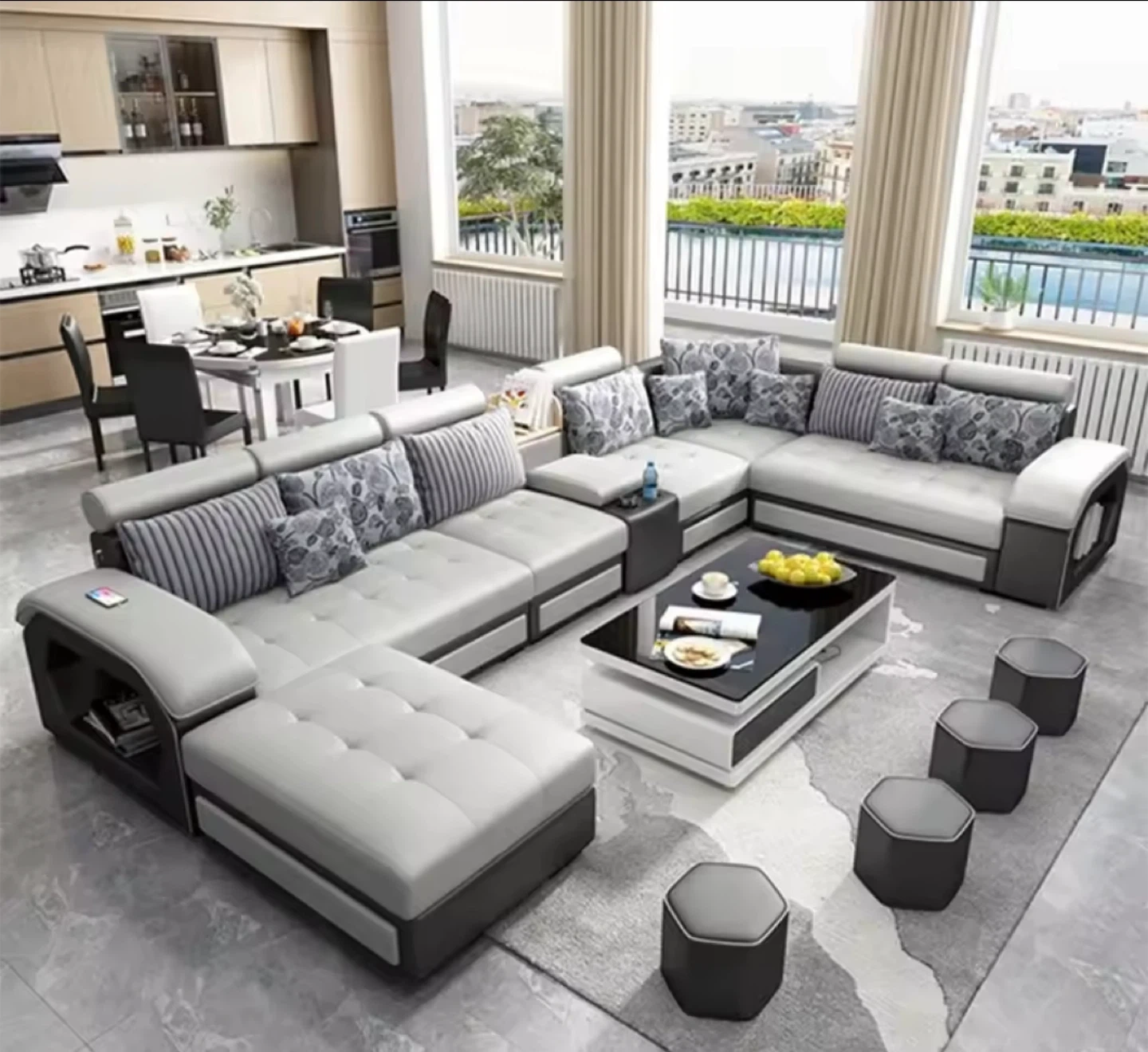 Selling a large sectional sofa set in great condition! It features a modern design with a combination of grey and white colours. Perfect for a spacious living room and offers plenty of seating. Comes with a matching coffee table and several ottoman stools