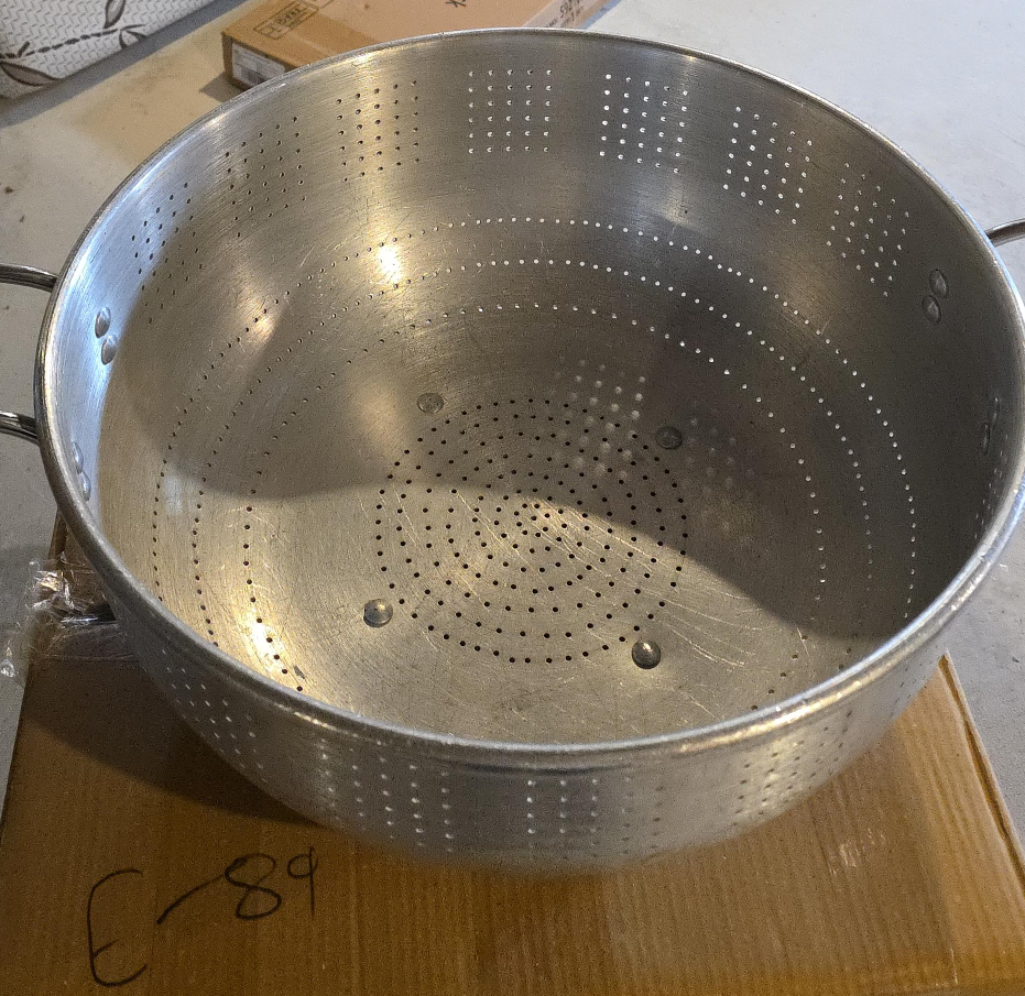 Selling a large, silver-coloured colander. It's in great shape and ready for its next home! Perfect for draining pasta or washing fruits and veggies. its only used to drain veggies no meats.