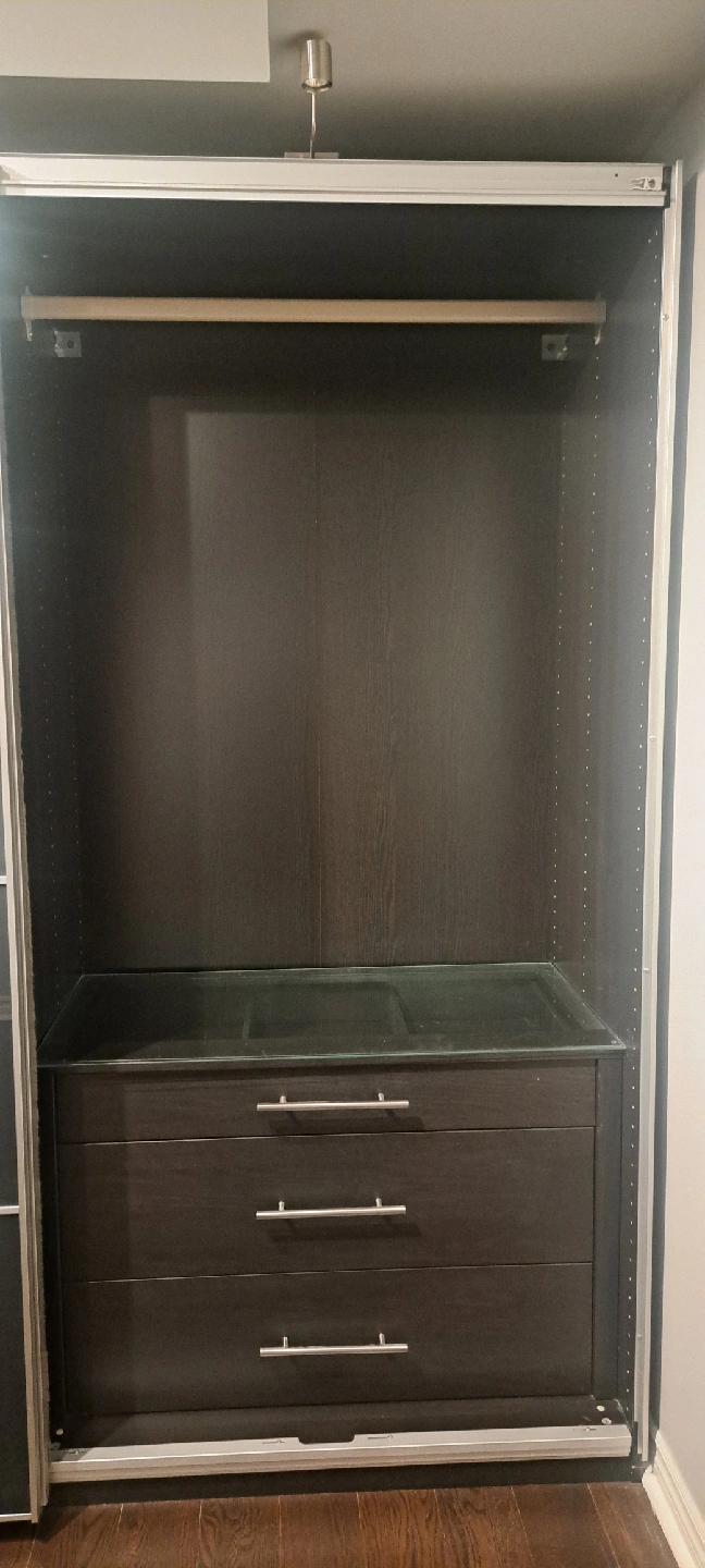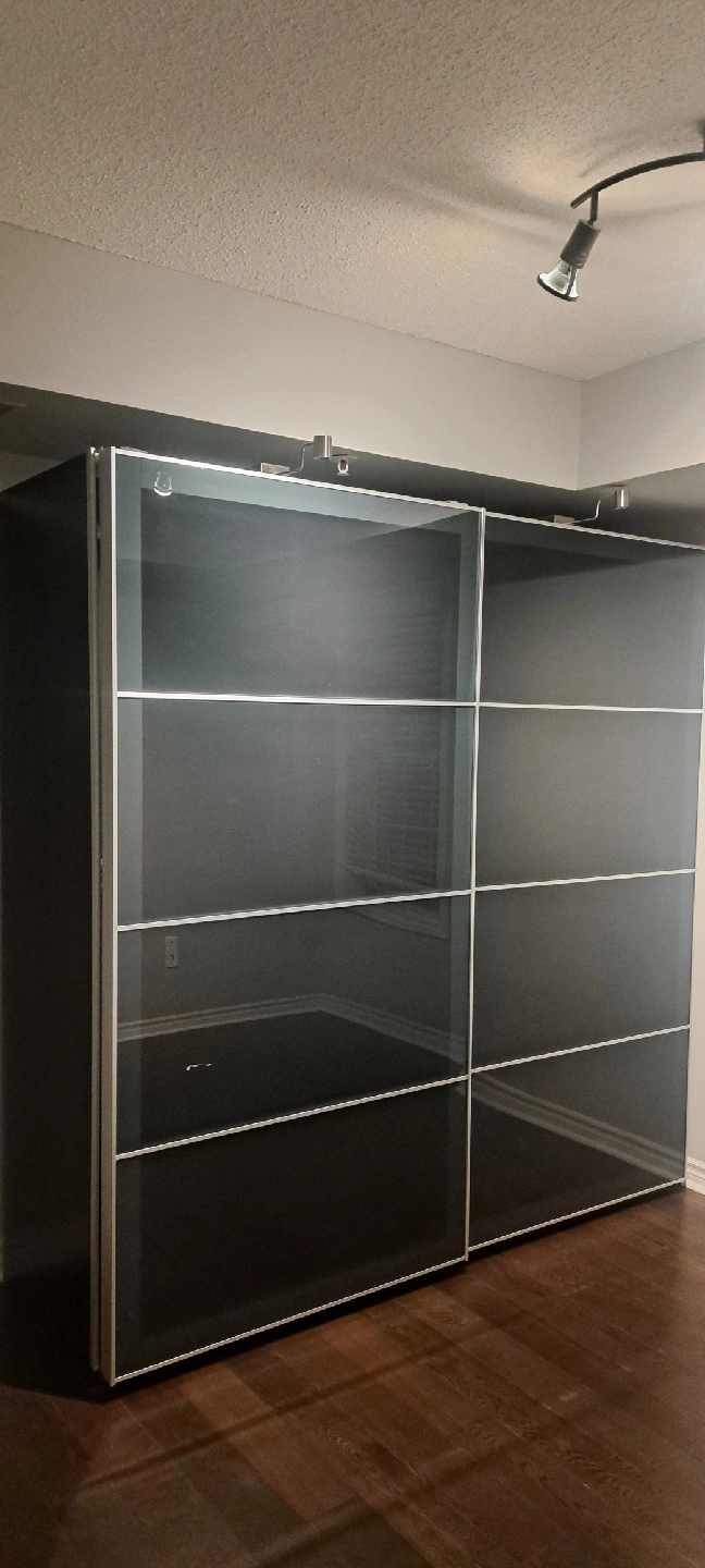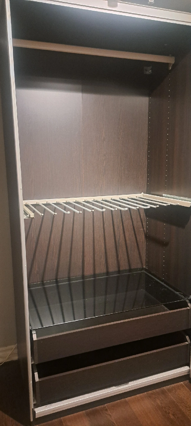Selling a large wardrobe with sliding doors. It features a sleek design and offers ample storage space. The interior includes drawers, shelves, and hanging rods, providing versatile organization options. Great for keeping your clothes and accessories neatly stored away