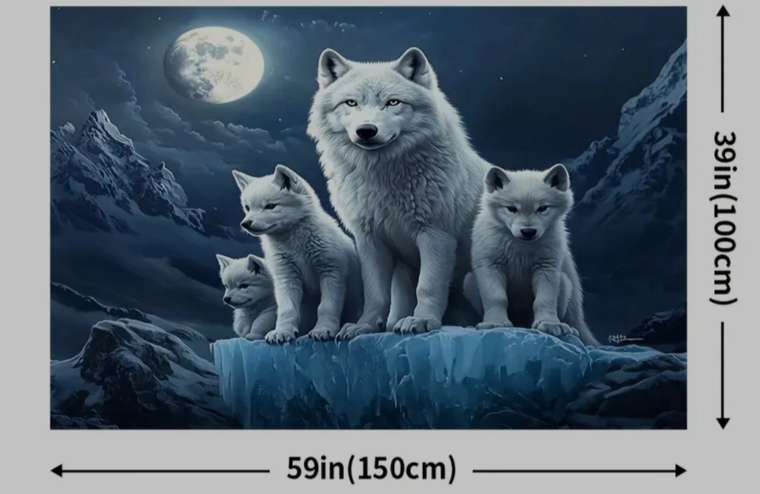 New! Stunning canvas print featuring a wolf family under a full moon. Large format, perfect for a statement piece. Vibrant colours and detailed artwork. can deliver depending upon the location..