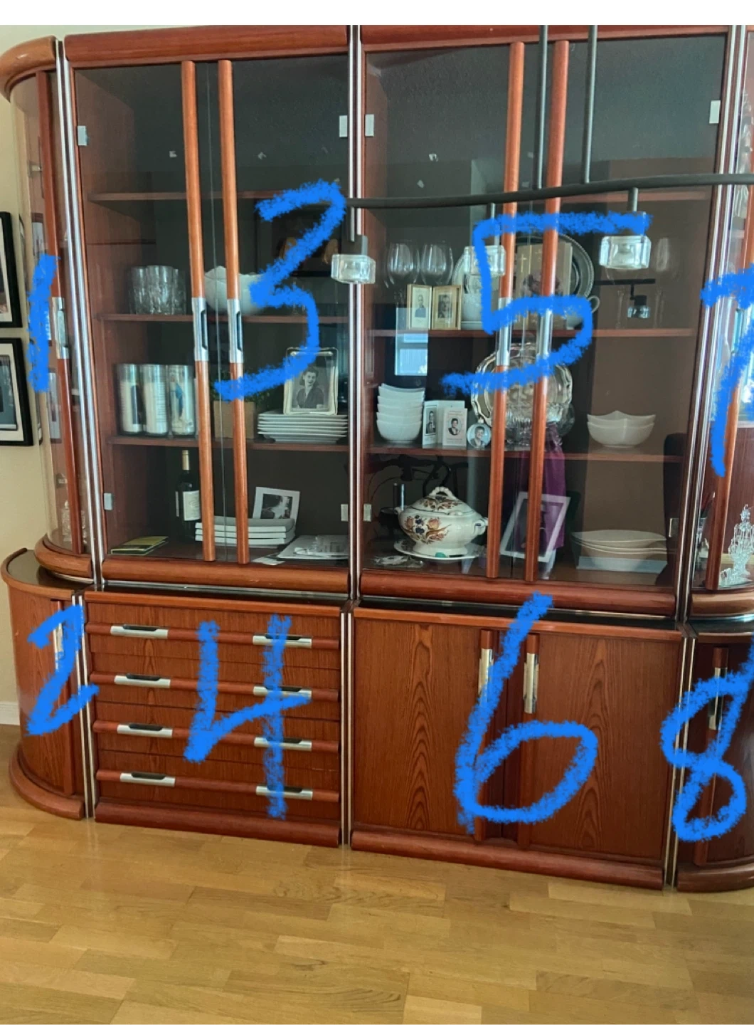 This beautiful china cabinet has 8 pieces that are all put together like in picture howevee you can customize it and make it smaller that is why I numbered each section as they can be moved to other rooms or corners however you prefer. In between the too glass cabinet and bottom cabinet there is removable mirrors. Very elegant. Looking to downsize. Caninet is in good condotion and ready to enhance any space in your home.