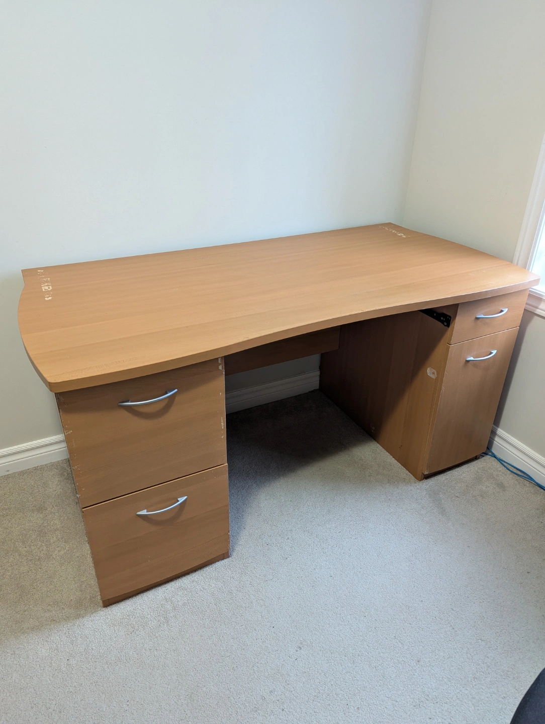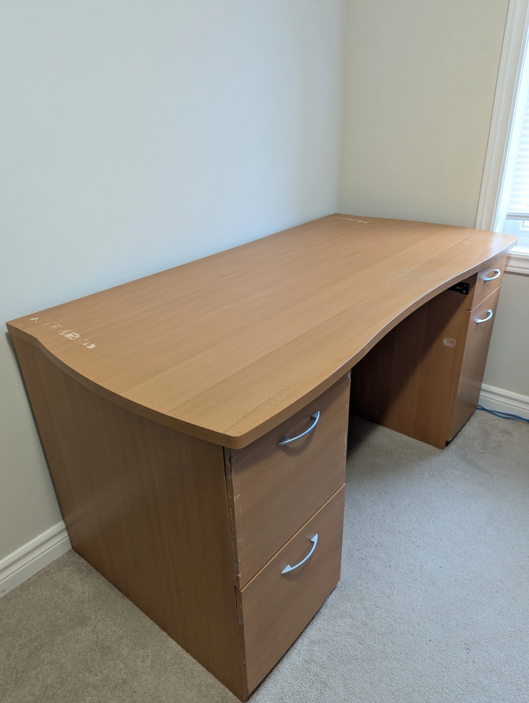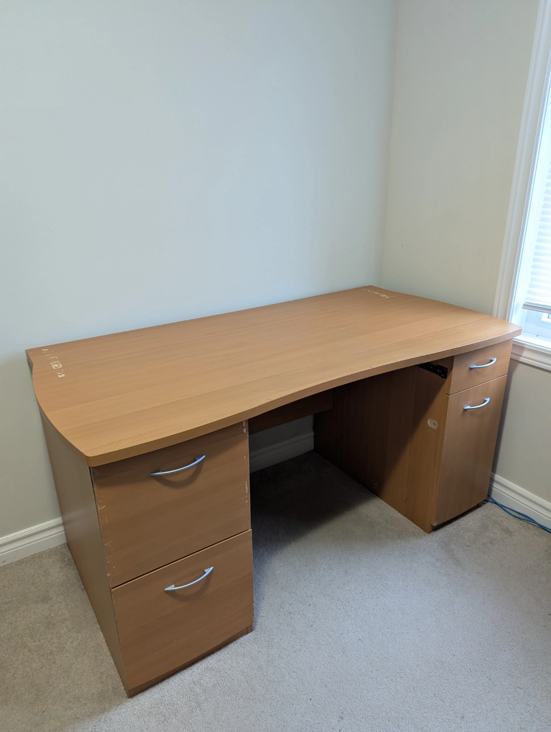 This used tan-colored desk is perfect for your home office or study space. It features a curved edge and built-in drawers for storage, offering both style and functionality. There are some cosmetic blemishes on the surface, but it remains a sturdy and reliable piece of furniture. * Colour: Tan * Drawers: Built-in drawers on both sides * Style: Curved Edge Dimensions w 58 inches, d 30 inches, h 30 inches Pick up at Indica street Stittsville. Disassembled for pickup.