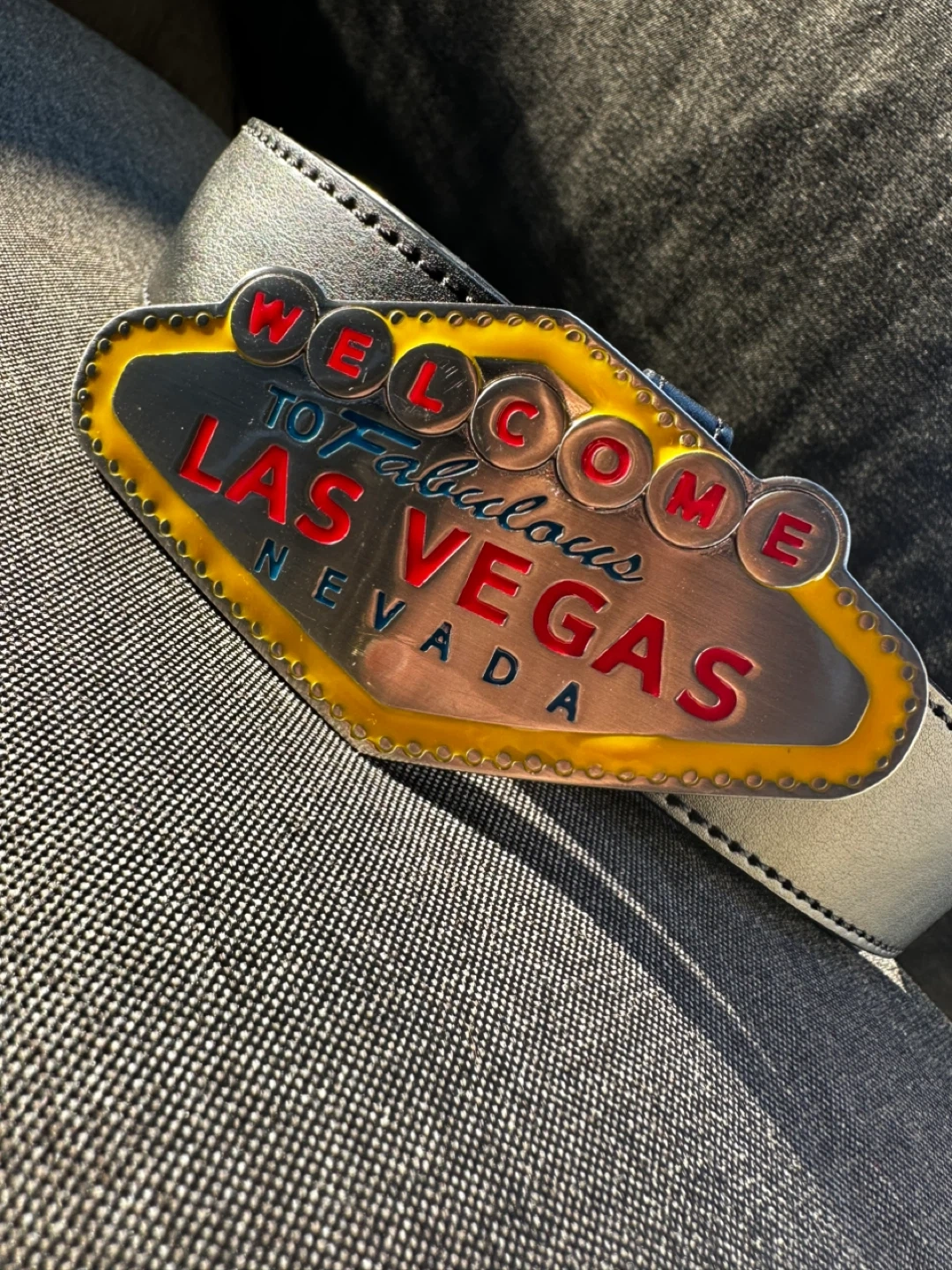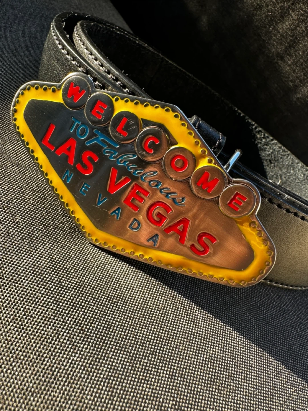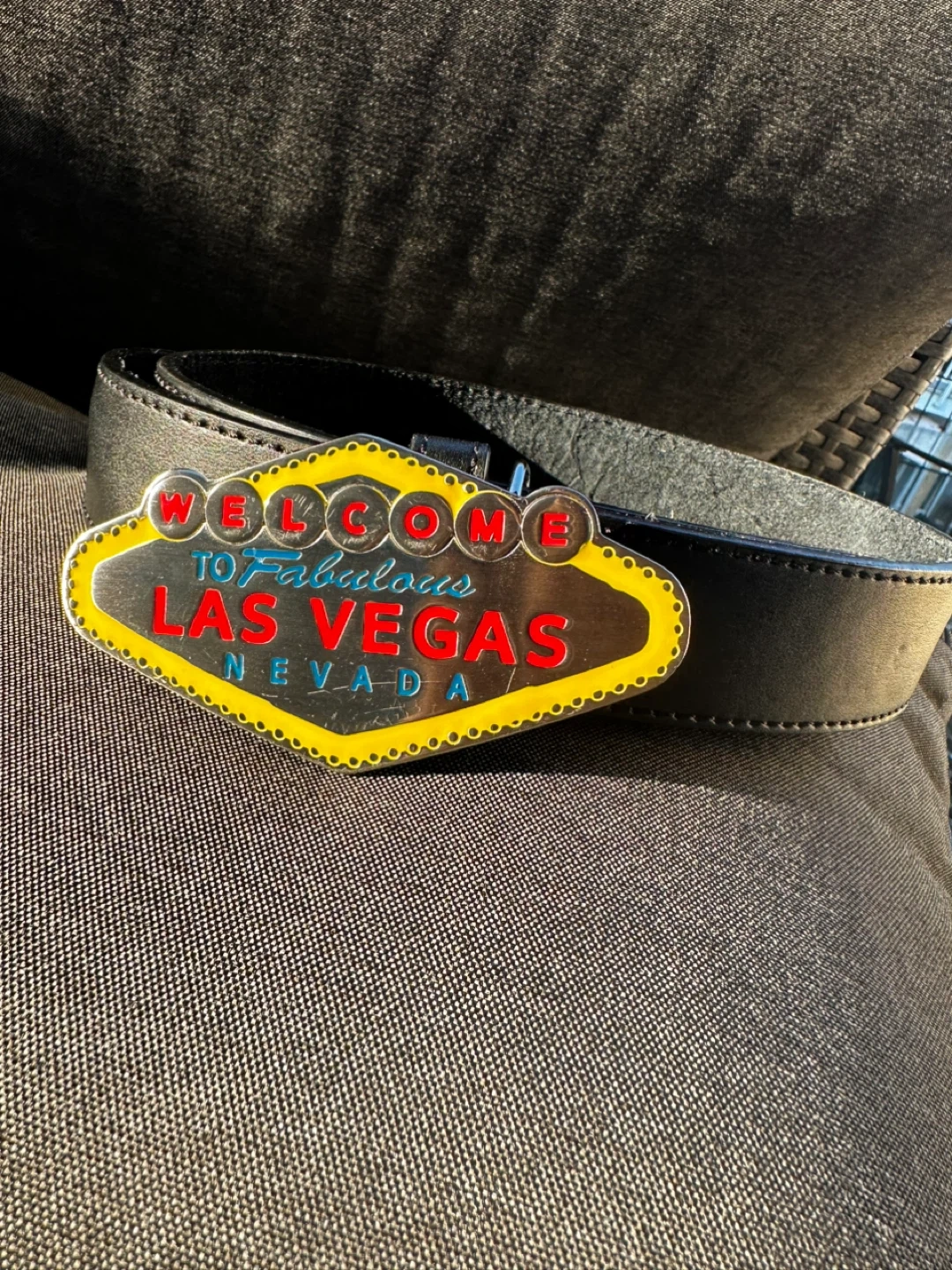 Cool Italian style leather belt with a Las Vegas buckle! The belt is a size 34 Self pickup at Coquitlam Parkway Blvd