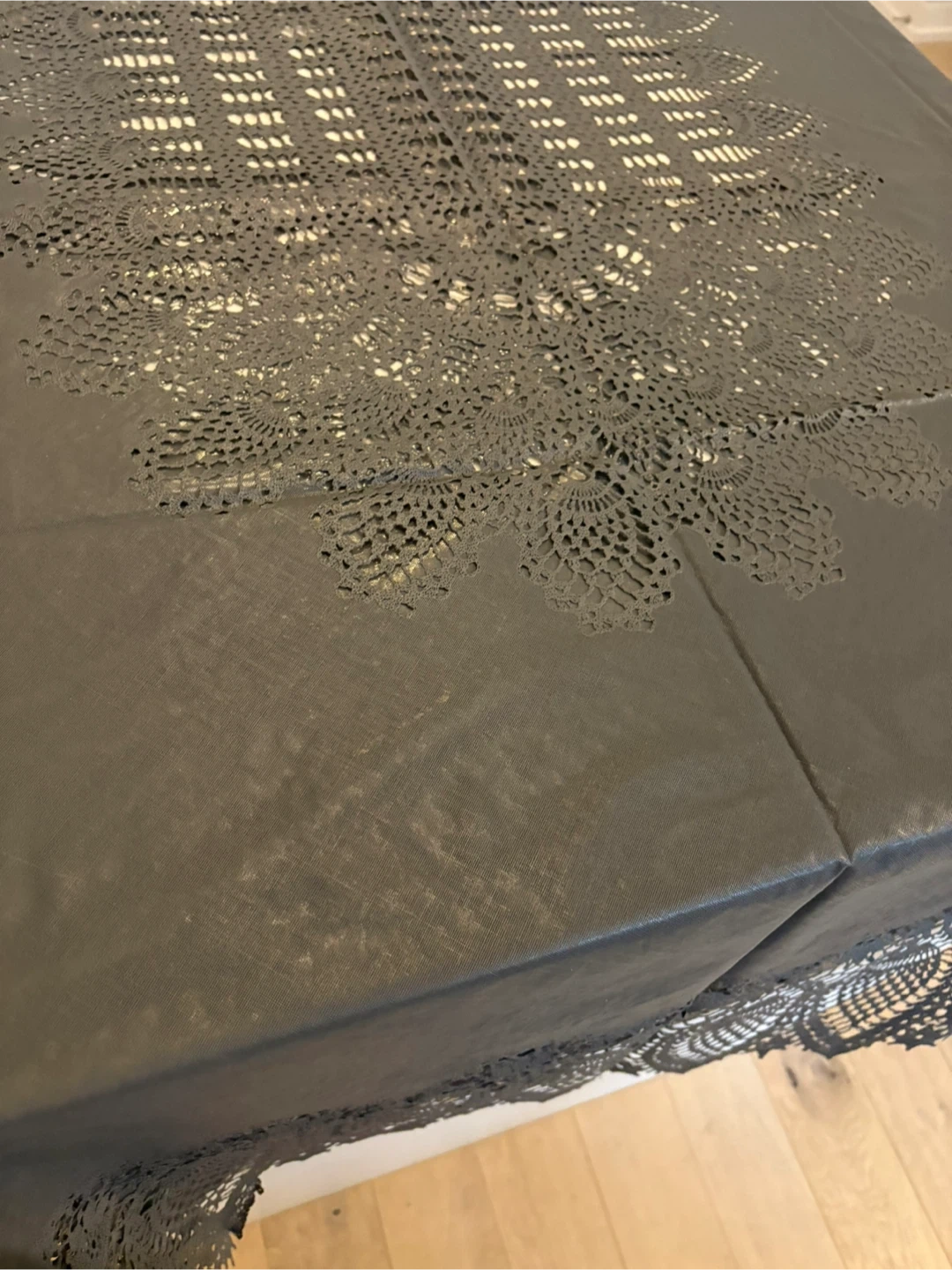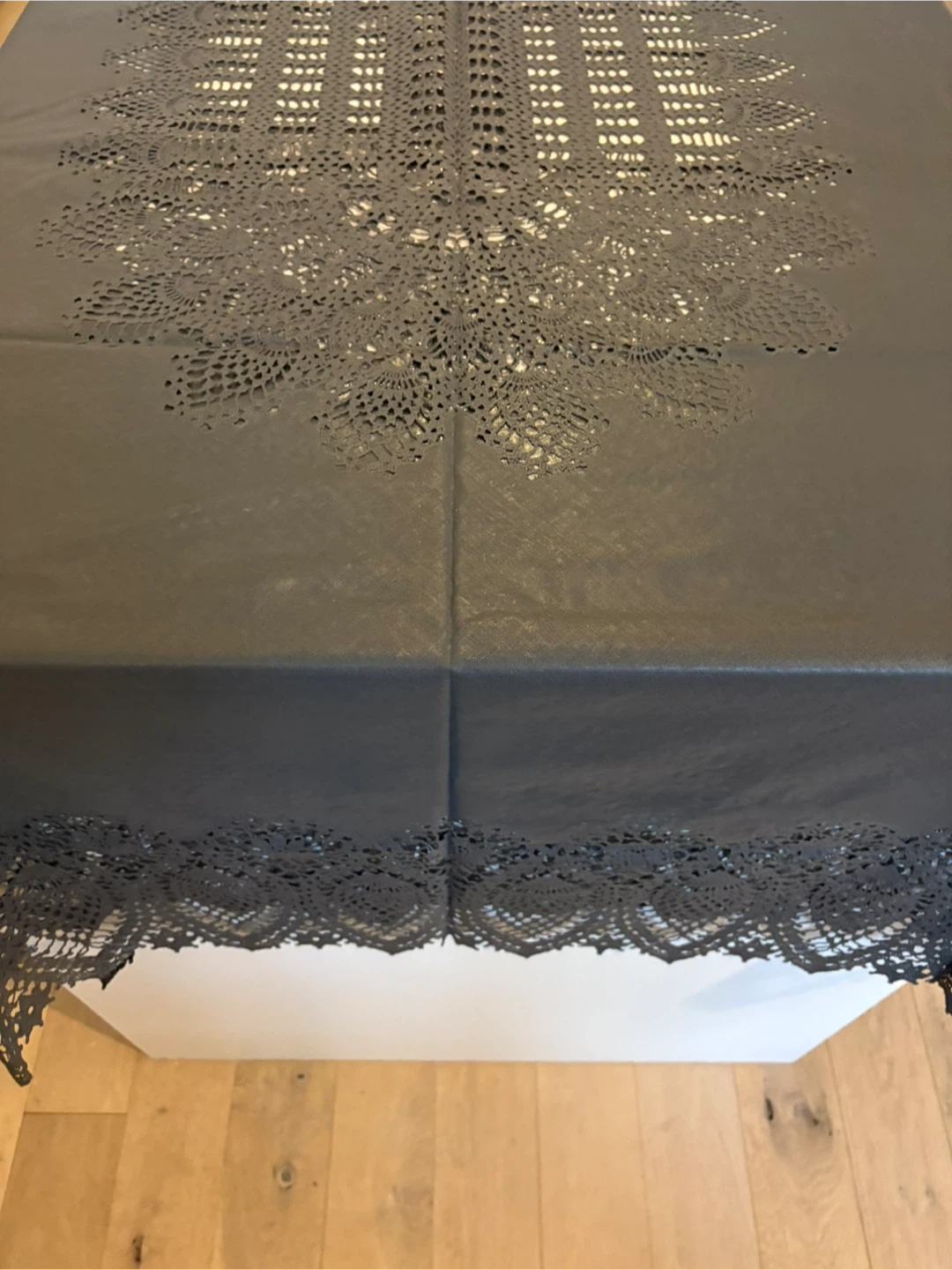 Laser Cut Vinyl “Lace” Table Cloth 60” x 108” from Portugal Grey/Charcoal Water resistant / wipeable / machine washable at low temperature Indoor/outdoor Suitable for a harvest table Clean, pet free, smoke free, pest free home NEW!