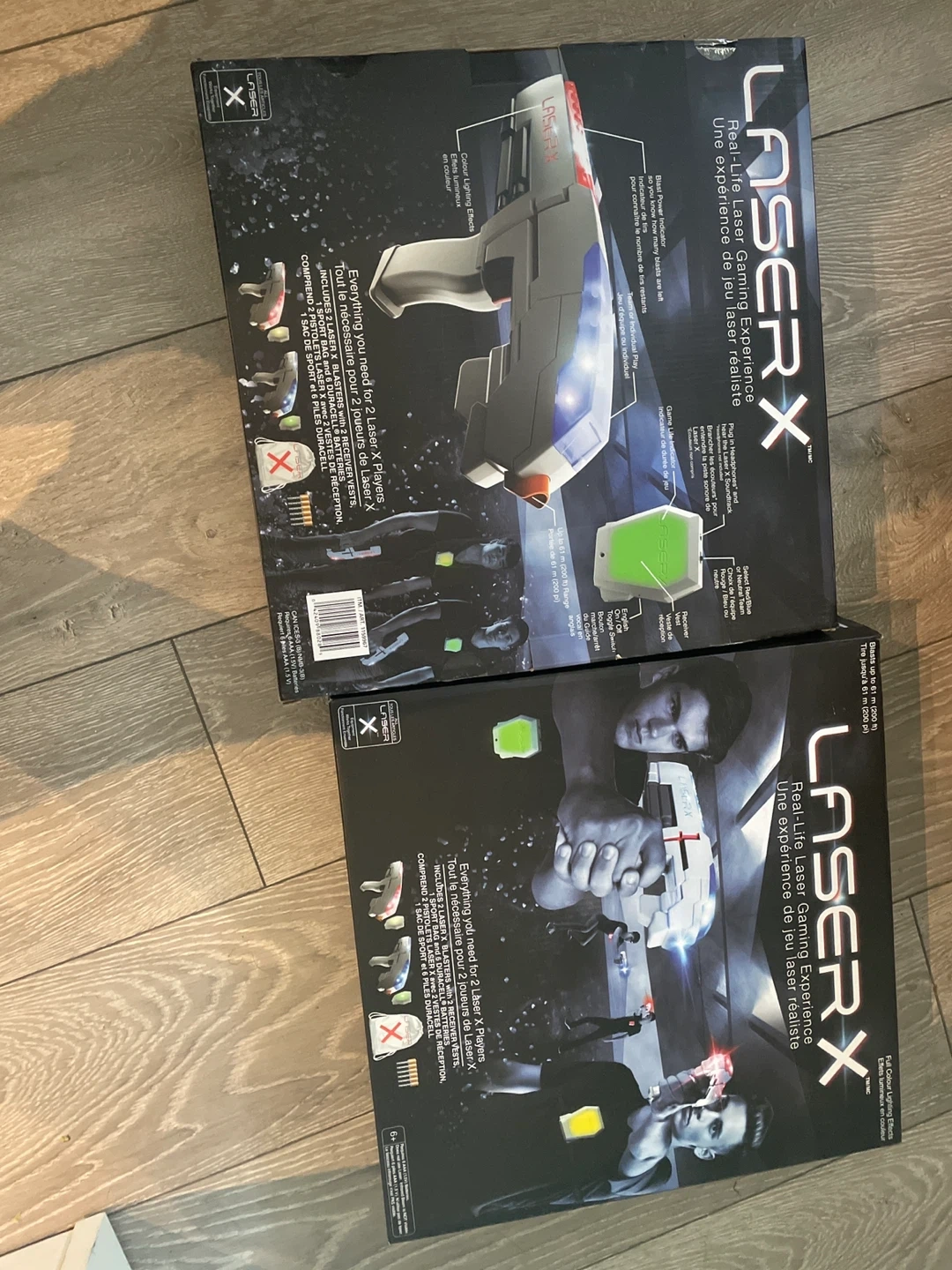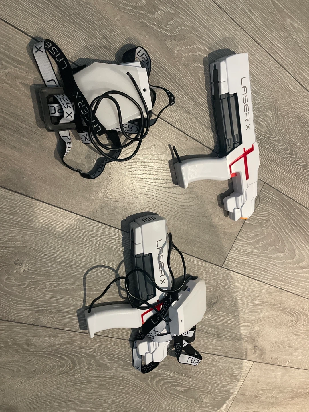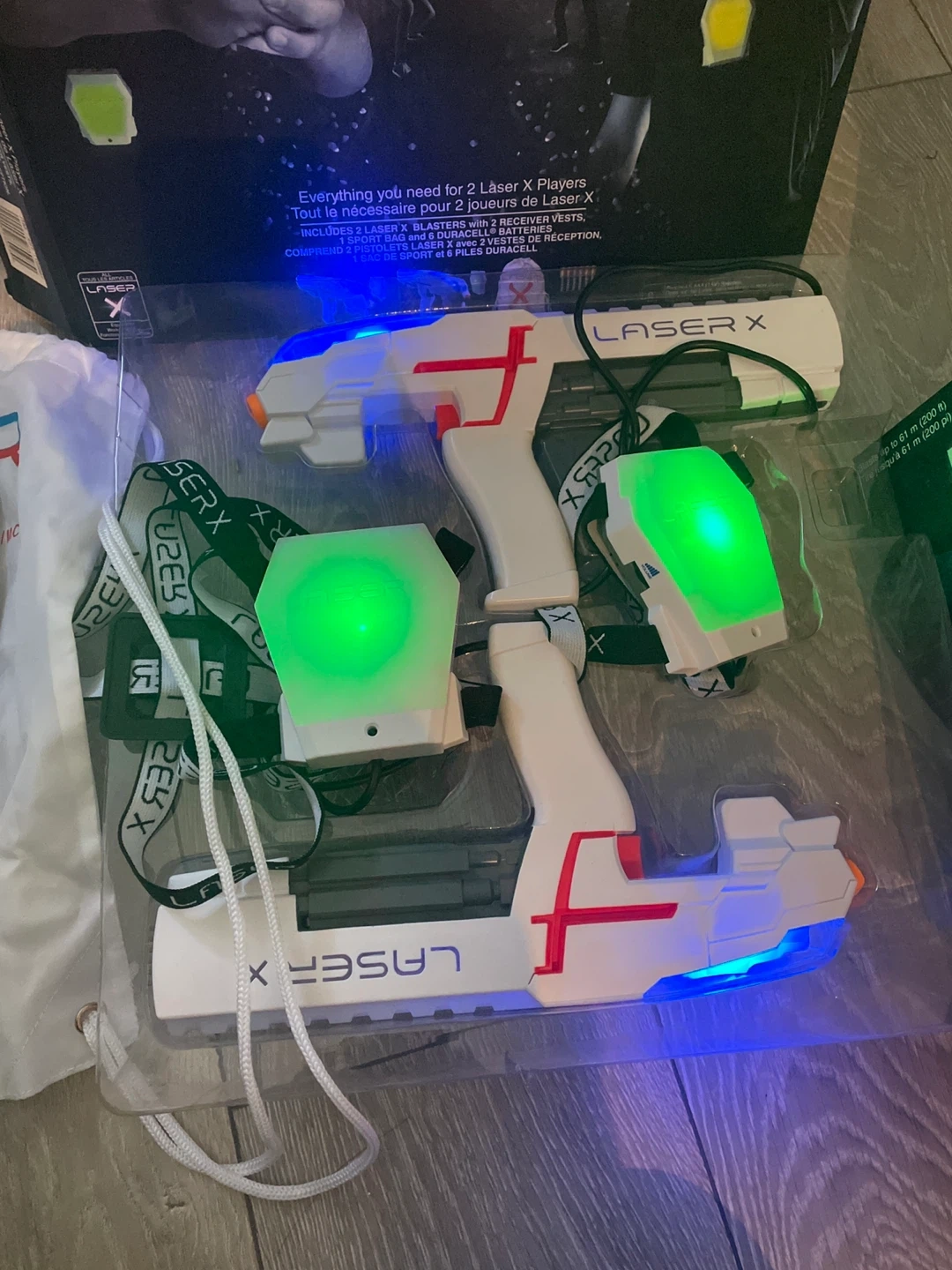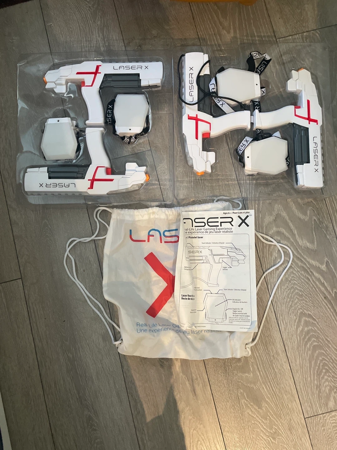 Get ready for some action with this Laser X Real-Life Laser Gaming Experience set! It comes with everything you need for 2 players, including 2 Laser X blasters and 2 receiver vests. Also included is a carrying bag and instructions. 2nd set is free if you want. See last picture. One has broken cord, other does not turn on (might just need new battery), and no bag.