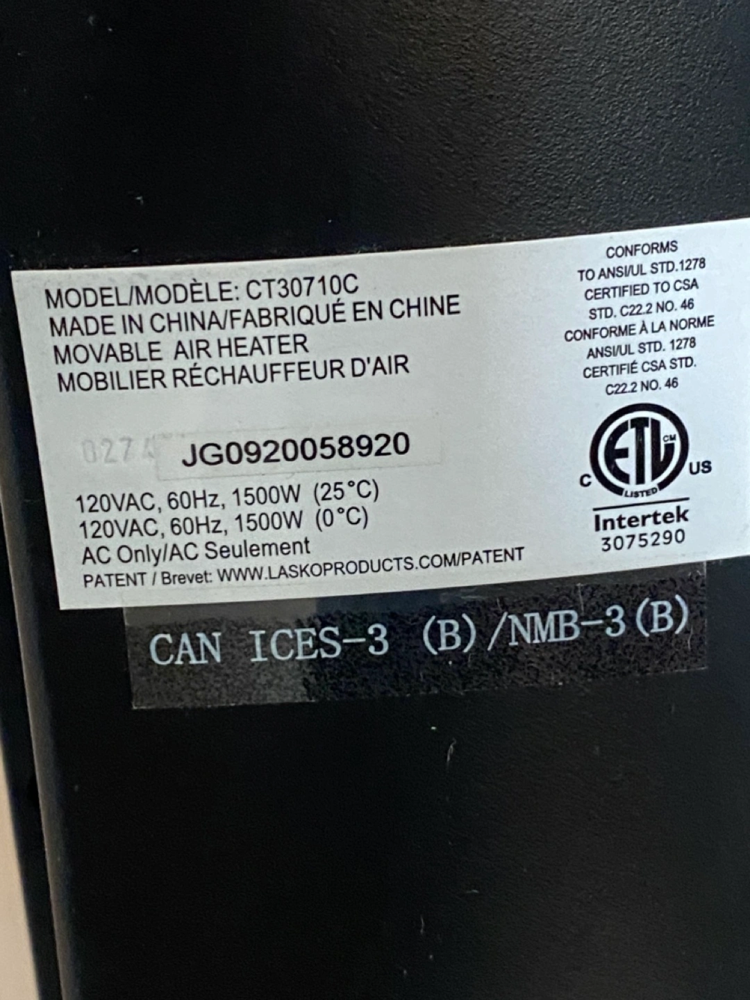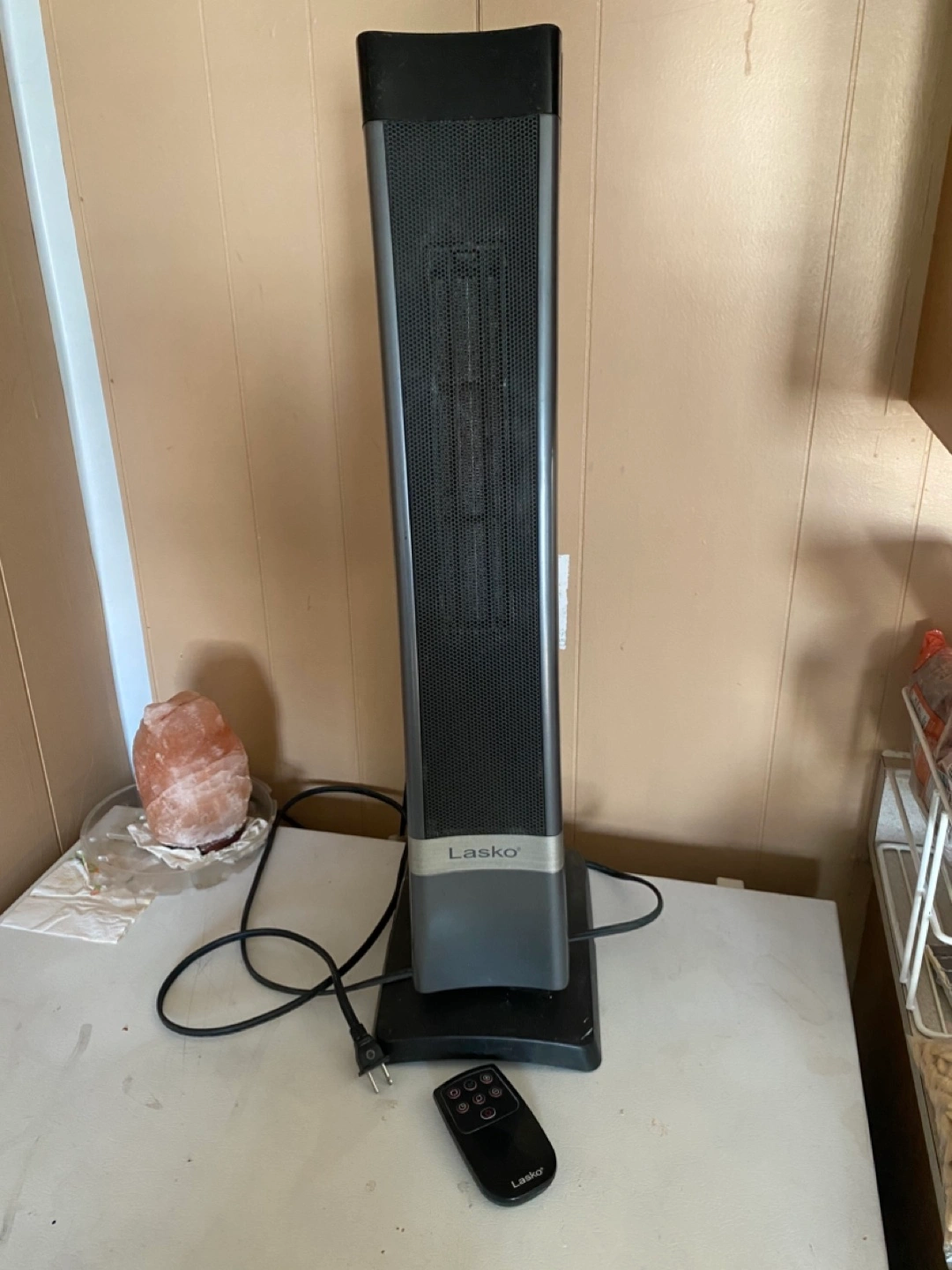 Lasko ceramic tower heater. Model CT30710C. Includes remote control. 1500W. Good for supplemental heating. We’re in Waasis, but go into Fredericton often if that helps.