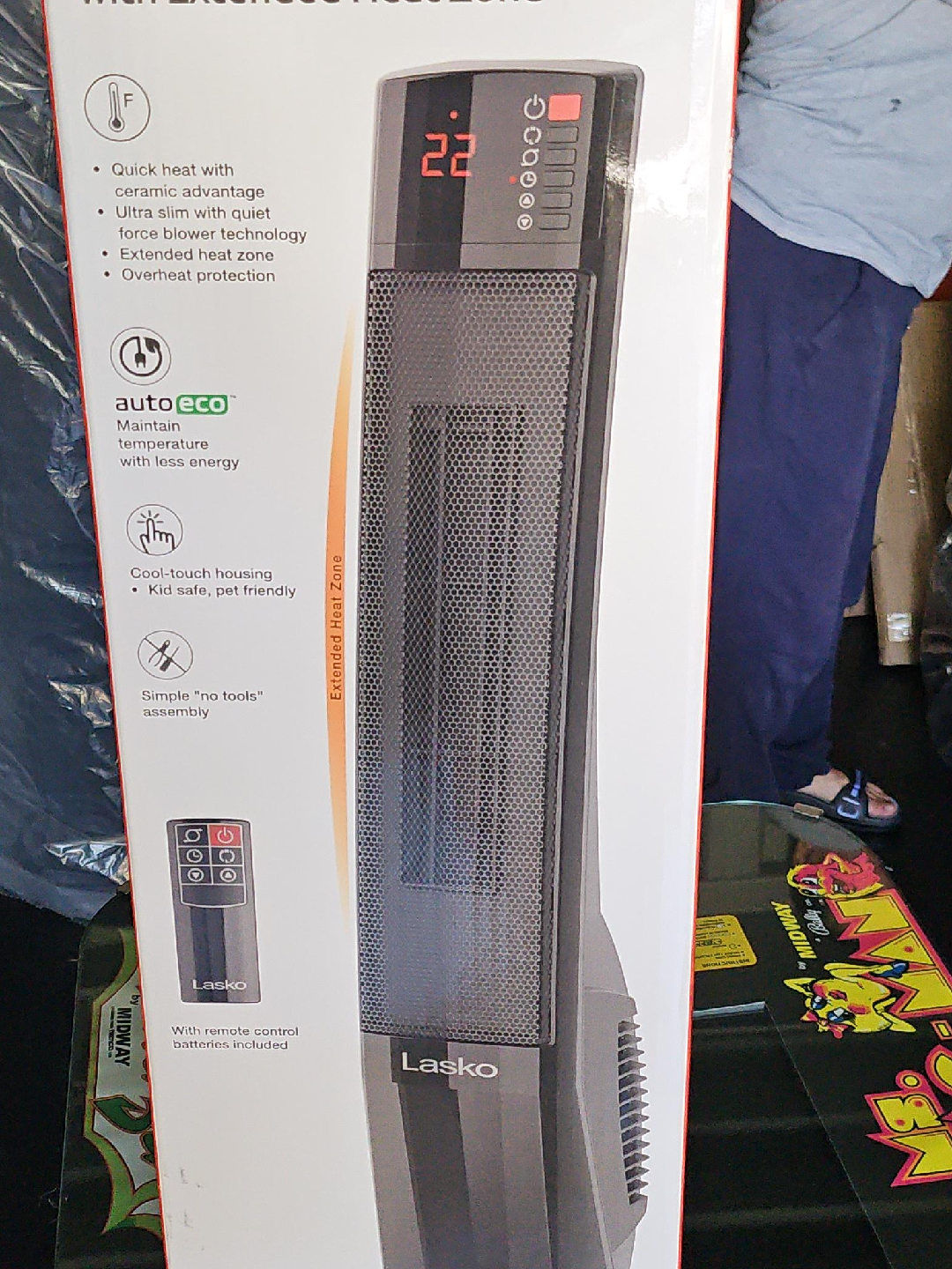 Selling a Lasko ceramic tower heater. It features quick heat with ceramic advantage, ultra-slim design with a quiet force blower technology, and an extended heat zone. It also has overheat protection, auto eco mode to maintain temperature with less energy, and a cool-touch housing, making it kid and pet friendly. Simple "no tools" assembly required. Includes a remote control with batteries