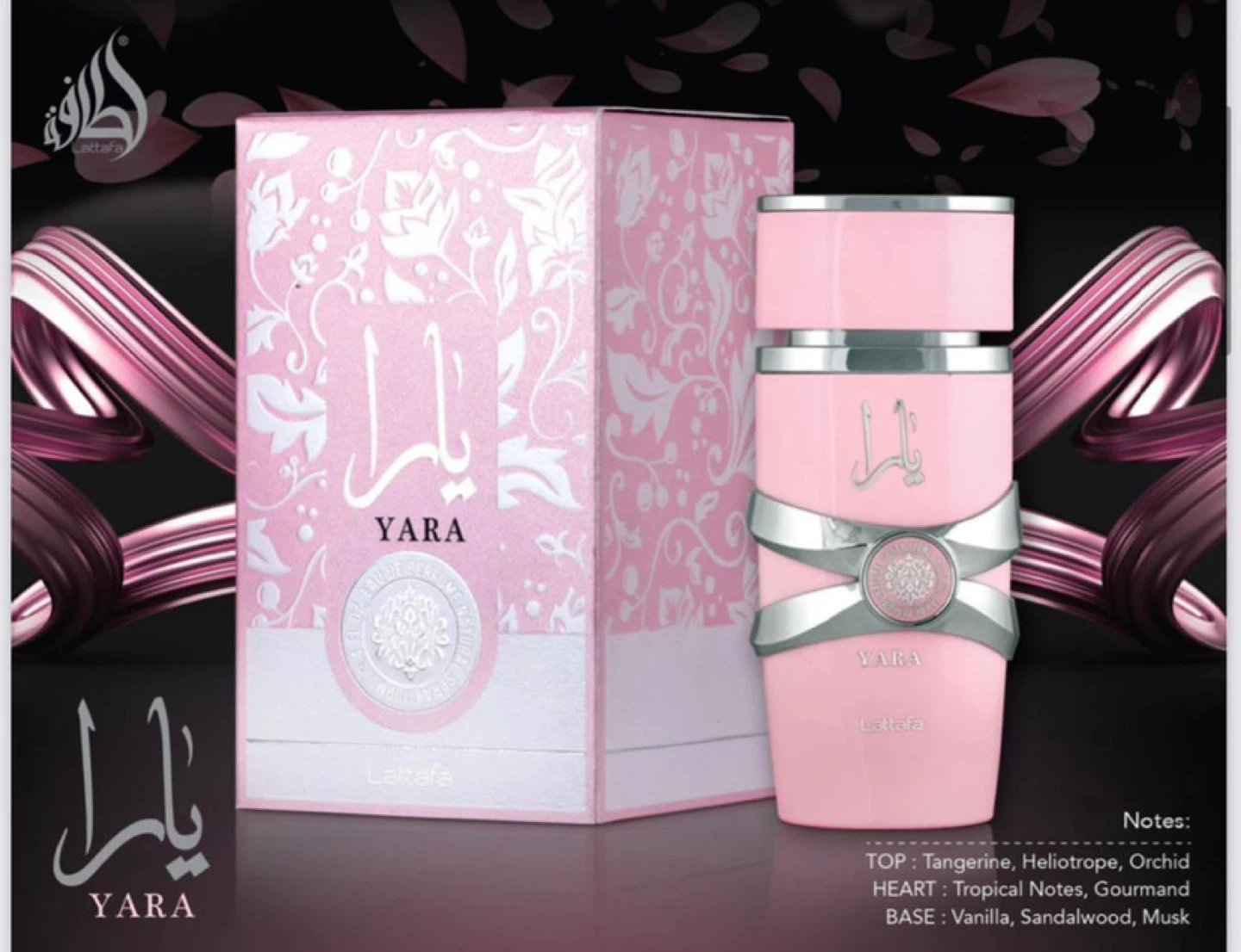 Selling a bottle of Lattafa Yara perfume. This fragrance features top notes of tangerine, heliotrope, and orchid, followed by heart notes of tropical notes and gourmand accords, and finishes with base notes of vanilla, sandalwood, and musk