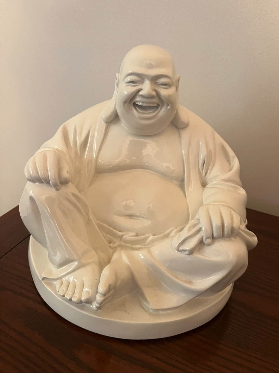 A lovely laughing Buddha statue, perfect for adding a touch of serenity to any room! It's made of ceramic and is in great condition.