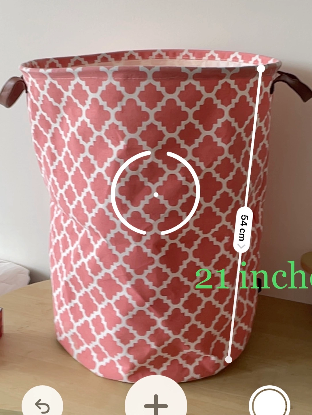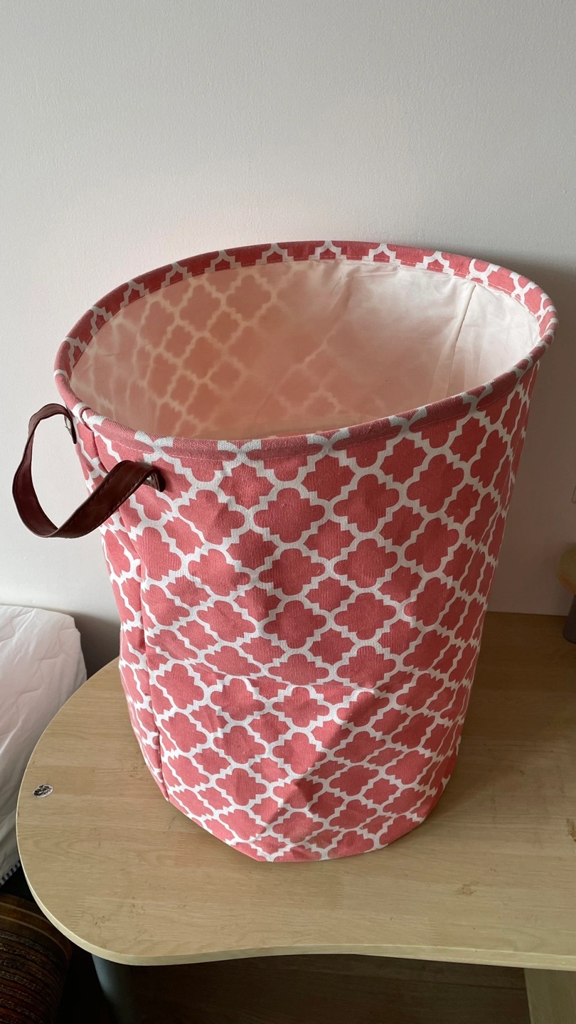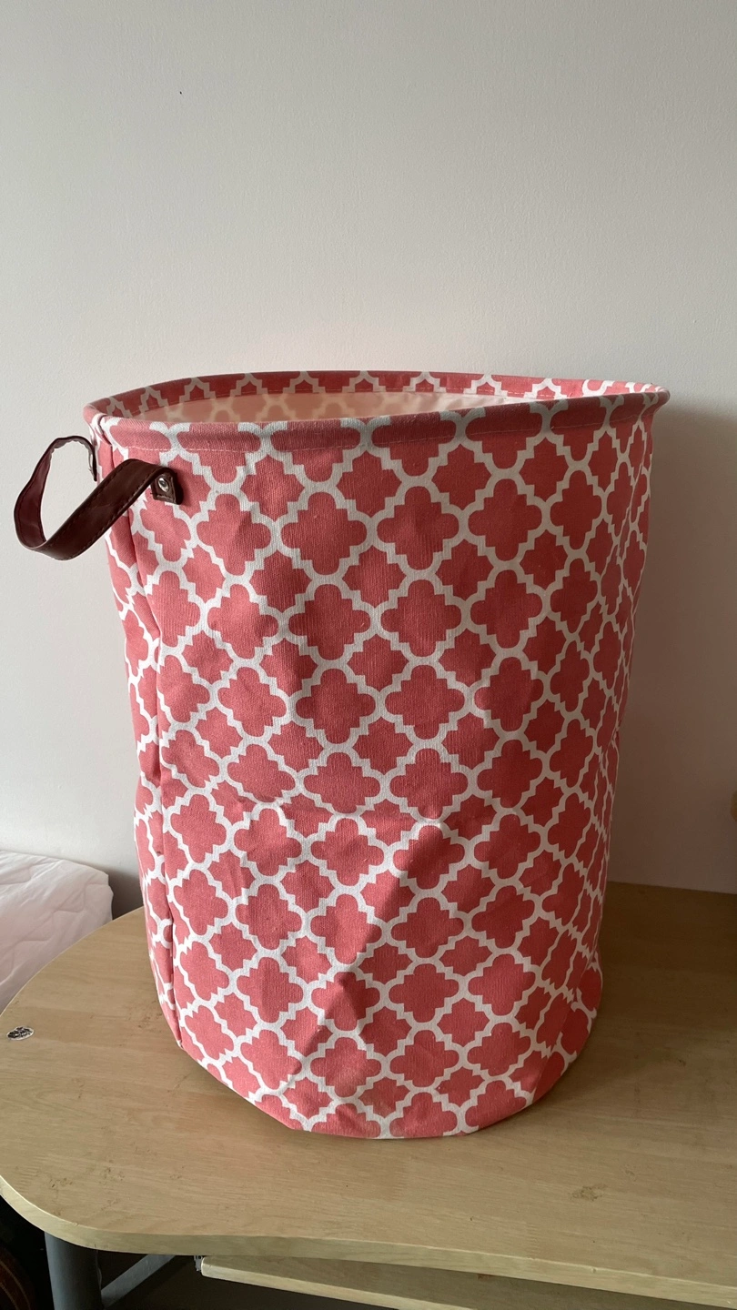 Selling a cute laundry hamper, perfect for any room! It features a coral and white pattern and is approximately 21 inches tall. It's in great shape and ready for a new home