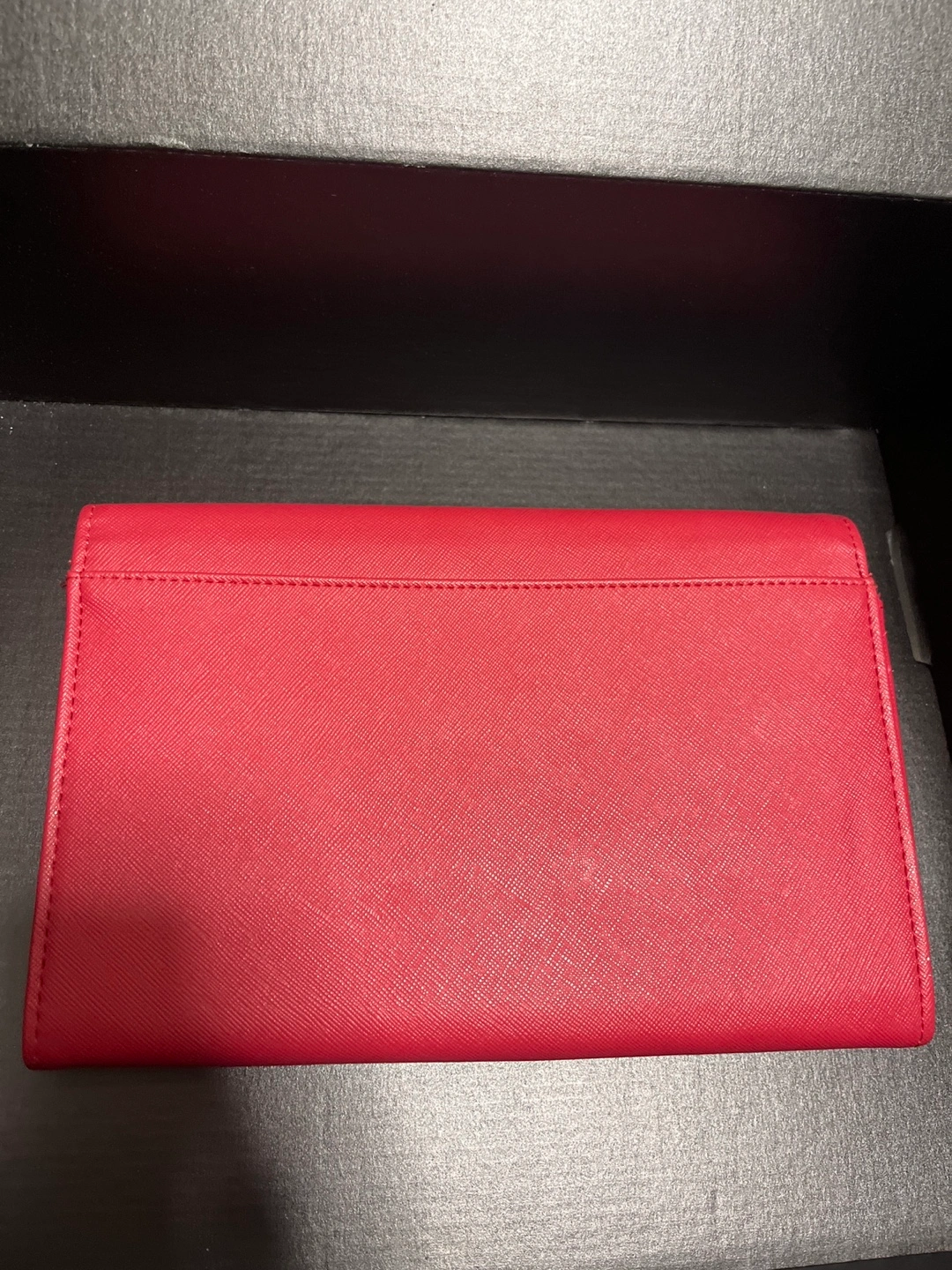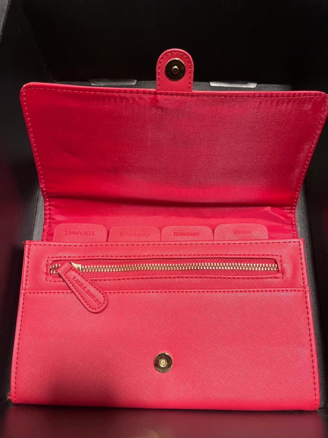 Red passport and documents holder. Multiple slots for “Passports, Documents, Itinerary and Other”. Gold zipper and hardware. Compact design. Excellent for travel.