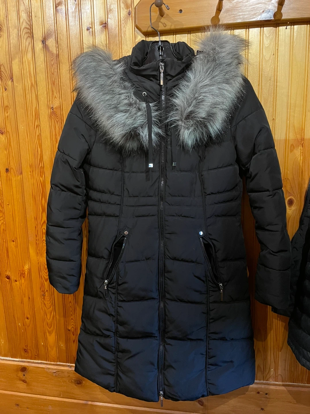 Selling a Laura Petites black puffer coat in size XS. It’s in great condition and ready to keep you warm this winter! The coat features a stylish grey faux fur trim on the hood.