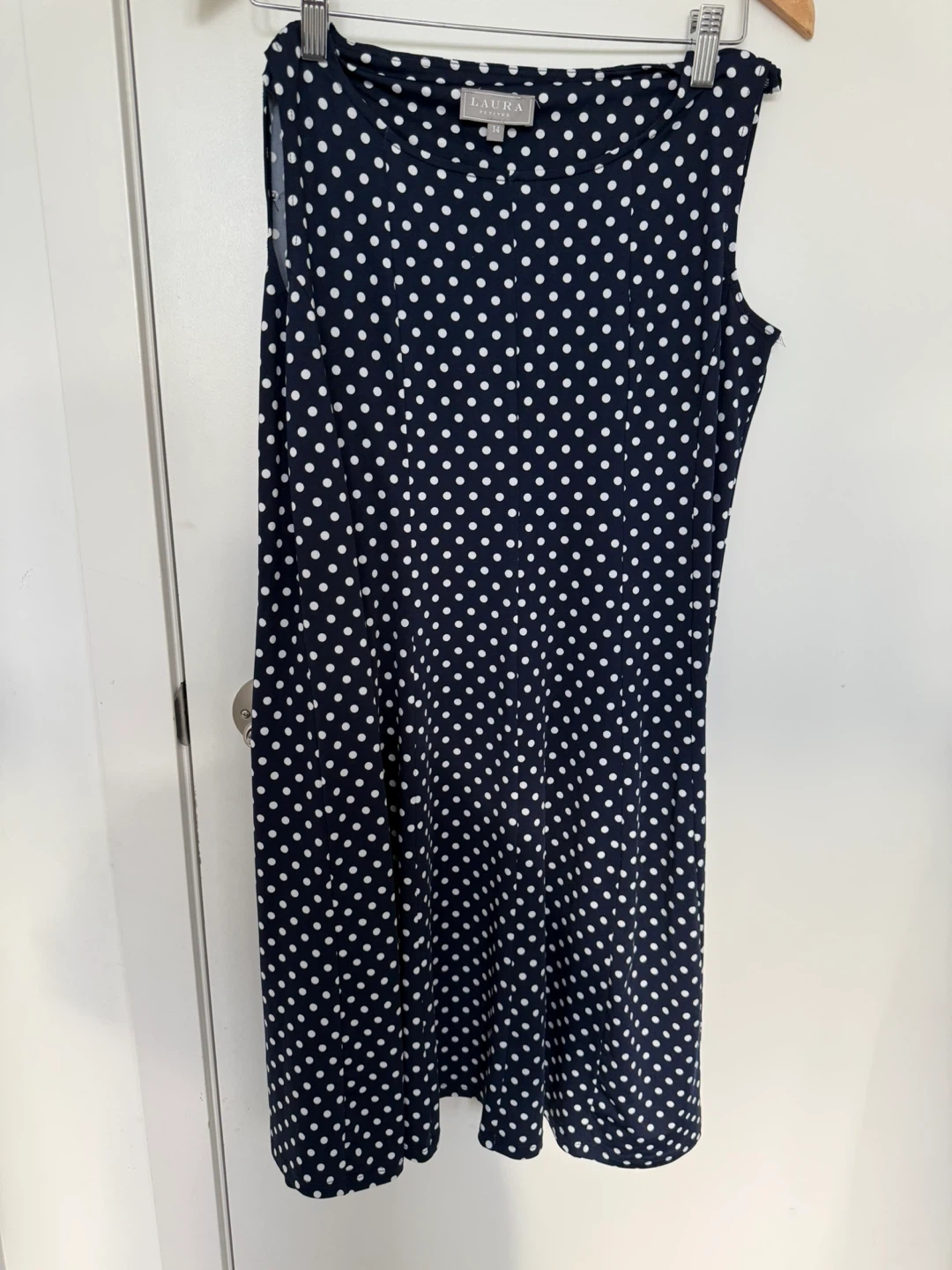 Cute Laura Petites dress in a navy blue with white polka dots! It's a size 14 and is in great condition. Perfect for summer!