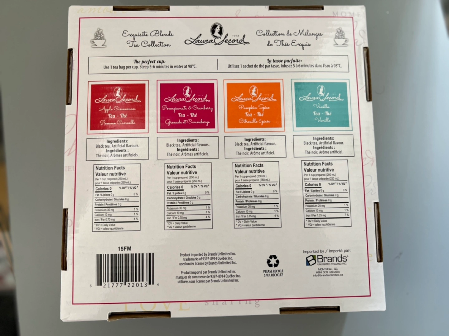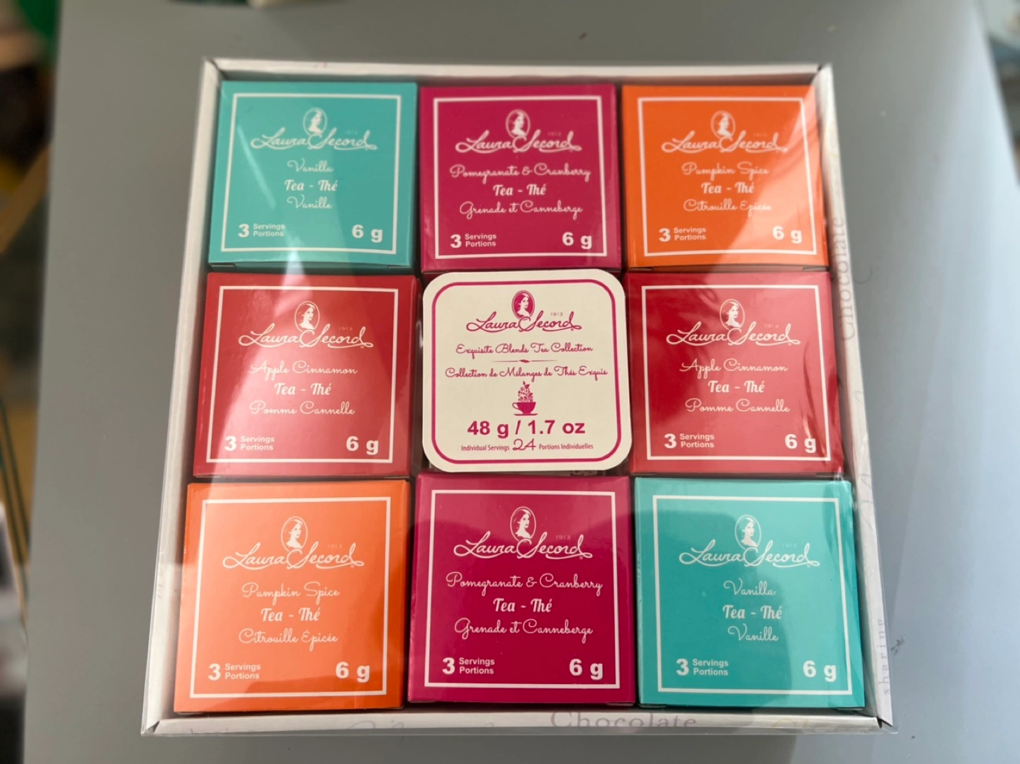Collection of six gourmet tea flavours. Variety pack includes Vanilla, Pomegranate & Cranberry, Pumpkin Spice, Apple Cinnamon, Each flavour contains 3 servings. Perfect gift.